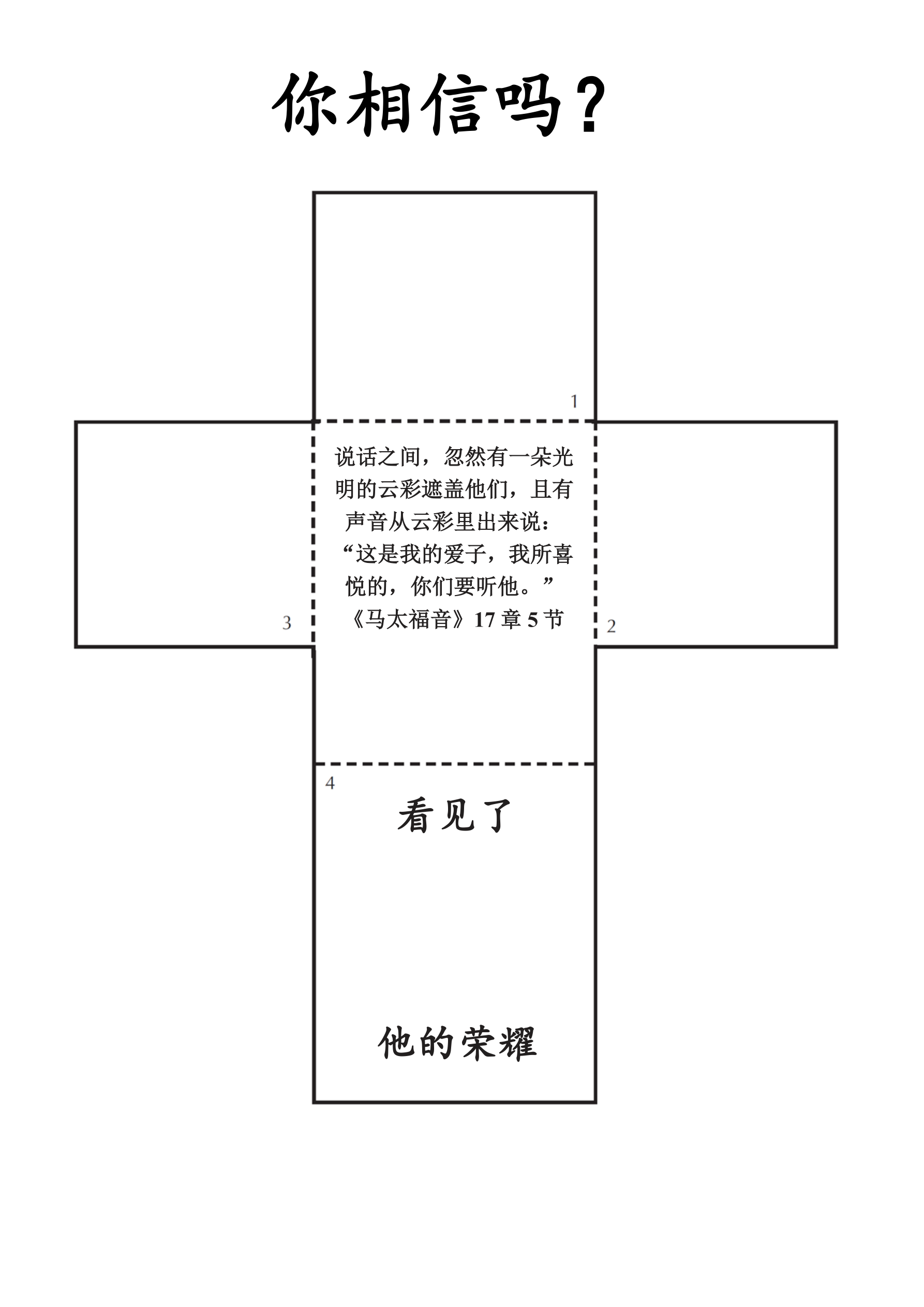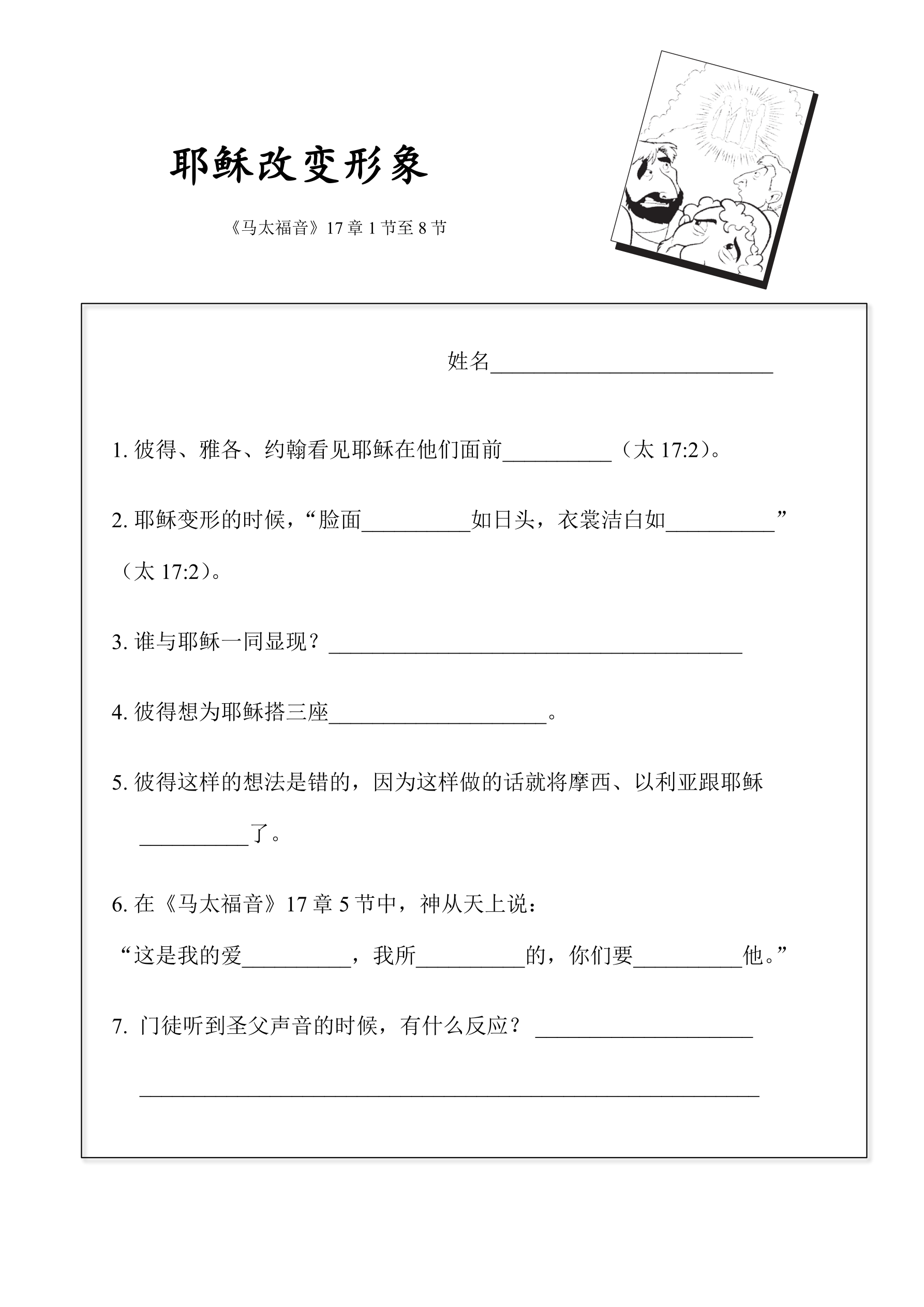 使用变像涂色单,指导孩子们将上面的云上色,并用棉球装饰云朵。可以在上面贴上小的金色或者银色的波纹,也可以用荧光笔上色来代表变了形象的基督身上的光。