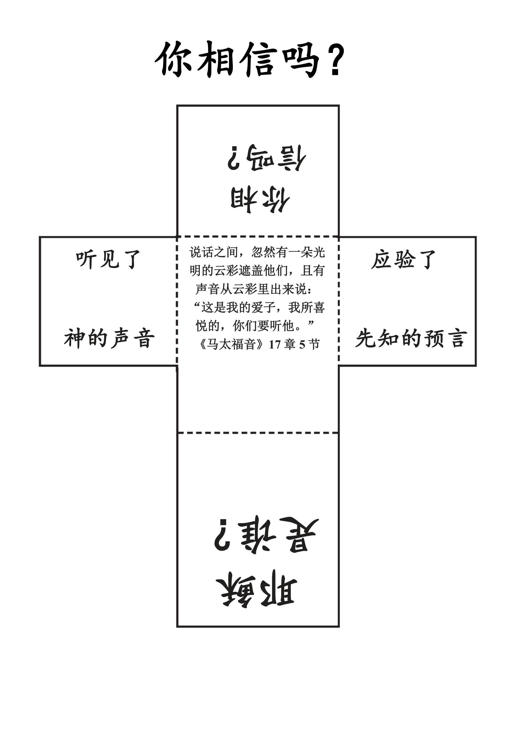 一个经典的变形例子就是毛毛虫变成蝴蝶的过程。给全班同学带来蝴蝶转变所经历的每个阶段的图片:毛毛虫、虫茧以及蝴蝶。也可以播放一段从网上找到的相关视频。问问孩子们耶稣有没有改变过,和孩子们讨论神的儿子成为人的时候是如何有了人性的。先描述一下耶稣如何从一个襁褓中的婴儿长大成人,然后解释他如何变了形象并向他的门徒显现他的荣耀。