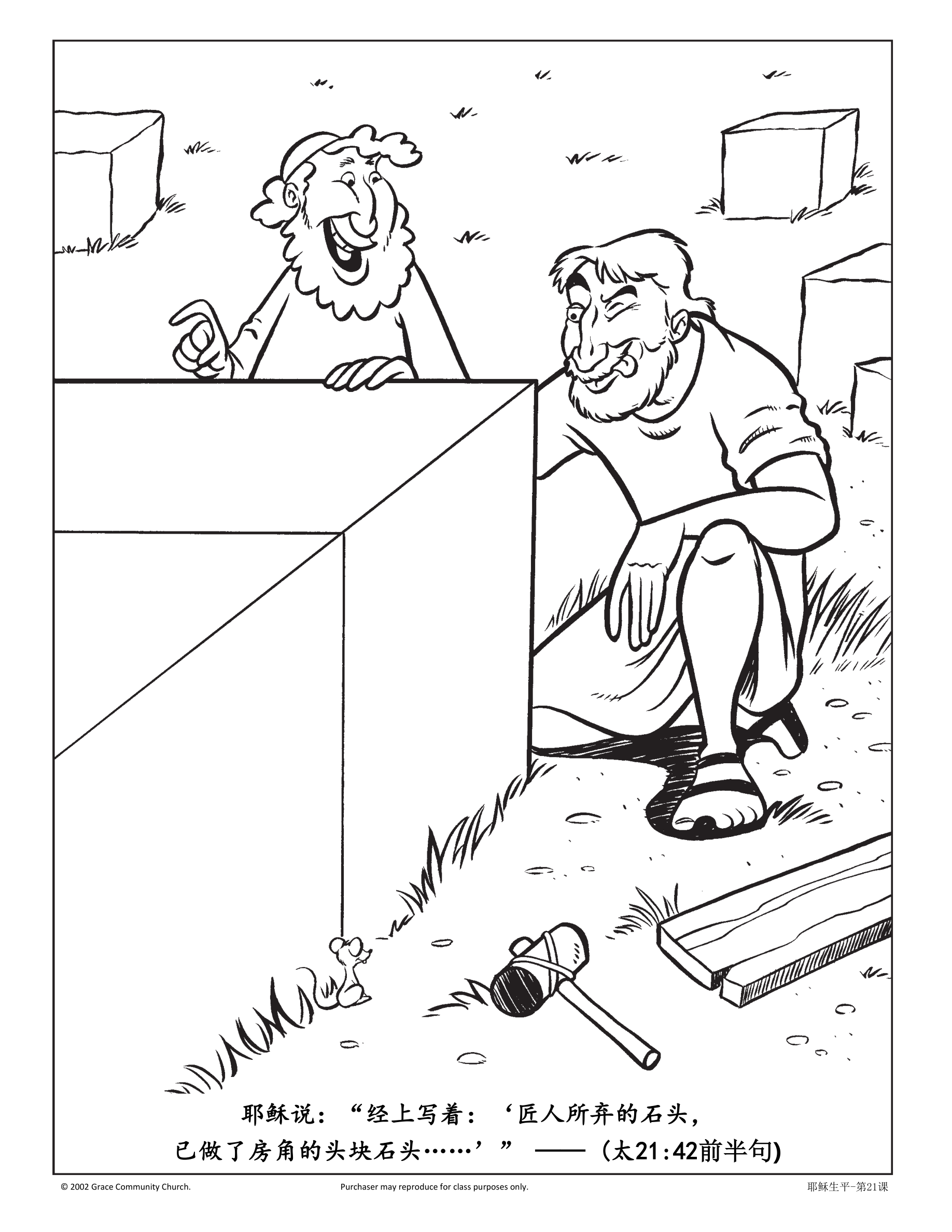 帮助孩子们理解被匠人所弃的石头最后成为房角石的比喻。用一些木块或者小纸盒建一个高高的建筑物。提前计算好足够的木块数量,使孩子们一人一块,最后还剩下一个。在开始搭建之前,告诉孩子们每人只能选一个木块。选好之后,老师在剩下的那块木块上写上“房角石”几个字,然后用这块“房角石”木块开始建东西。让孩子们依次将自己的木块递给你,并在房角石上建一面墙,将这块房角石一直放在建筑物底部的角落。给孩子们展示,如果你拿走最下面的“房角石”,这面墙就会倒塌。结束的时候读一下《马太福音》21章42节,告诉孩子们,在今天的课上会我们会学习这节经文告诉我们耶稣是谁。