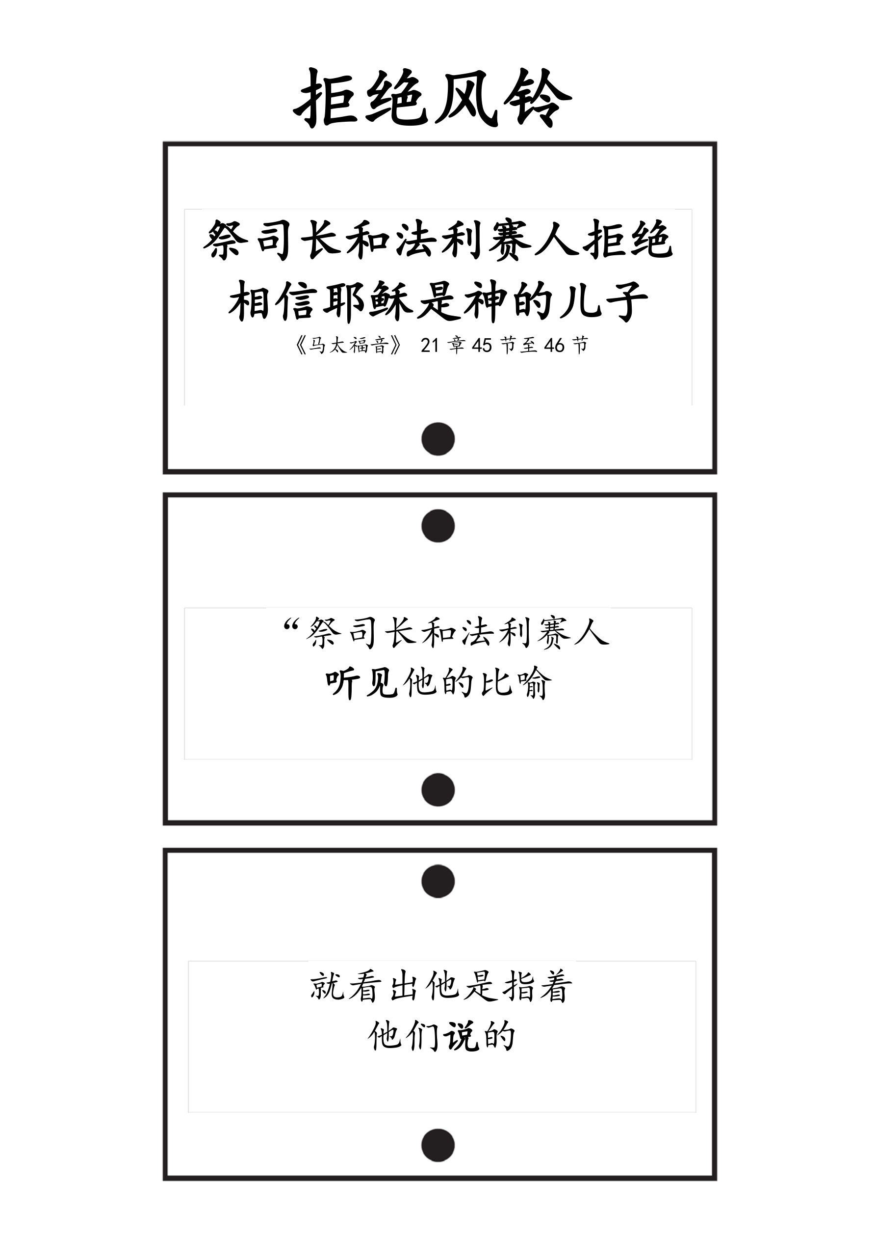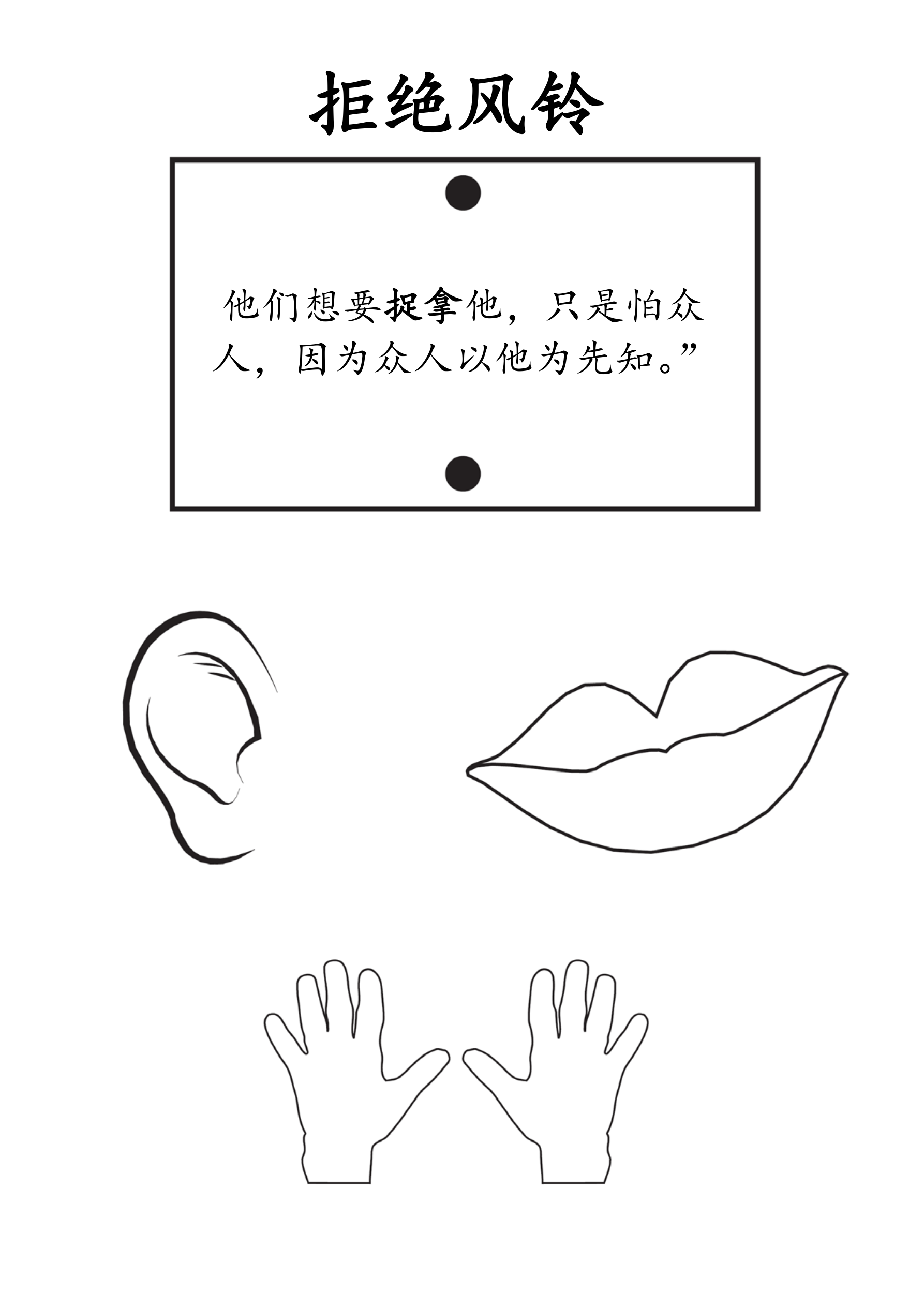 课堂说明:每位学生一份“拒绝风铃”手工页复印件,将每个框子都剪下来并在指定地点打孔。接着开始上色,并剪下耳朵、嘴以及手贴到相应的卡片背面。最后,帮助孩子们将卡片用线按顺序穿好并系紧。
