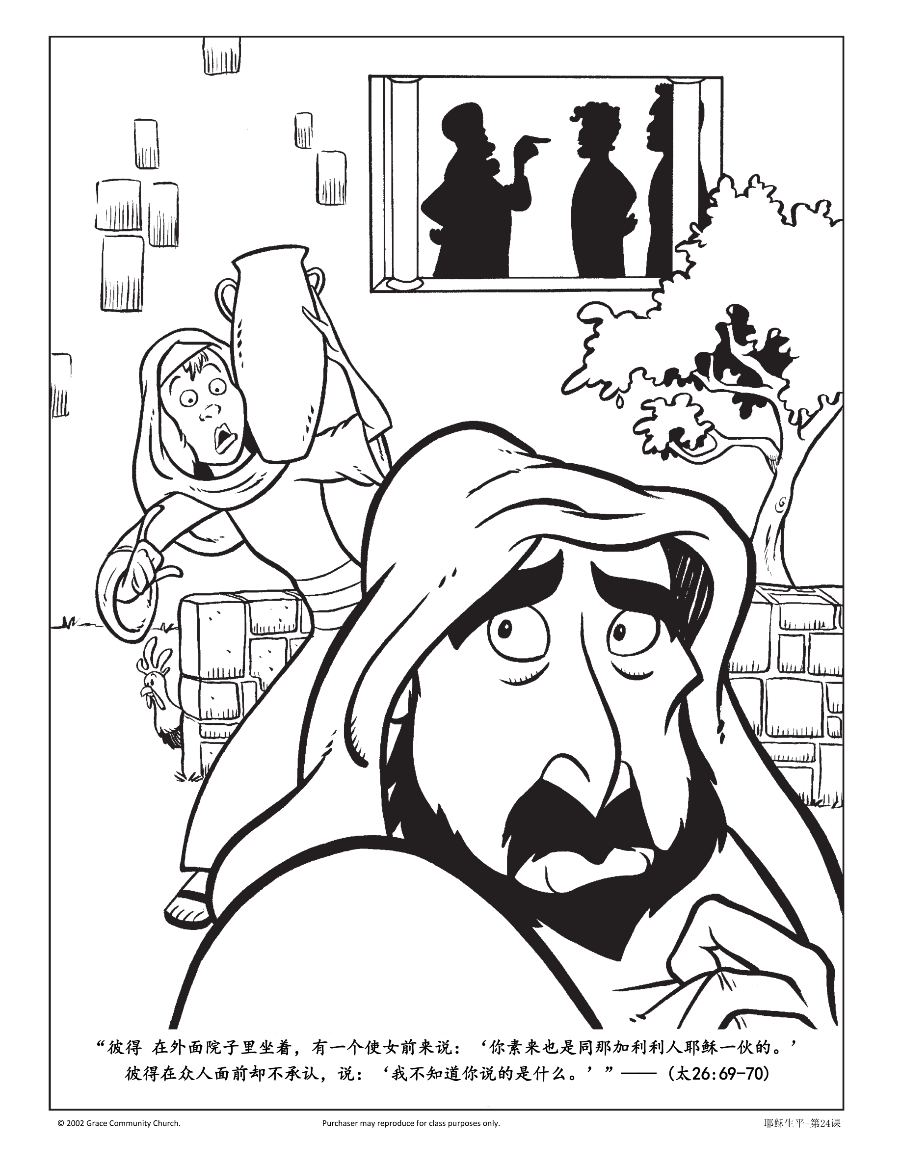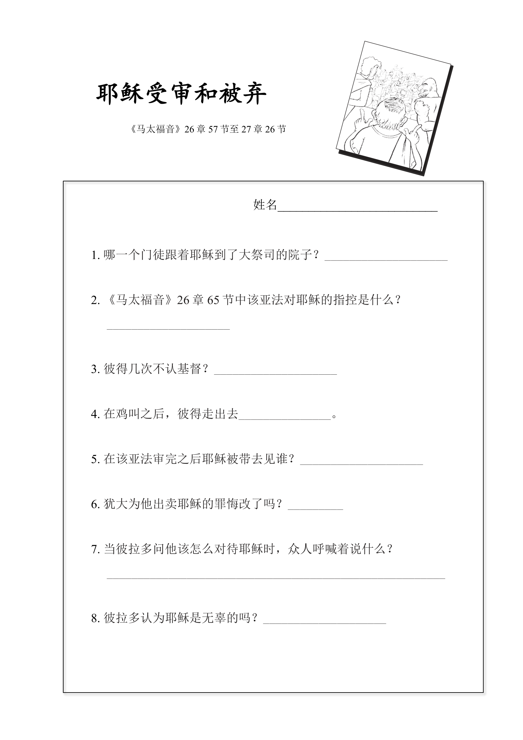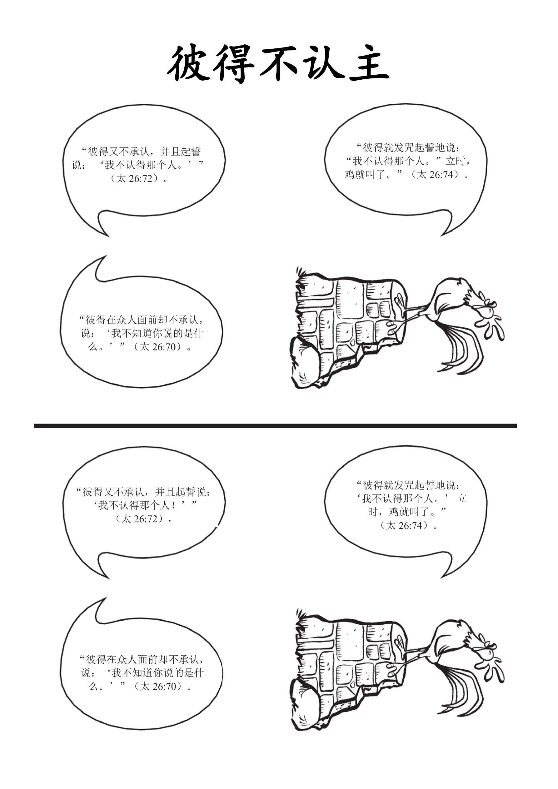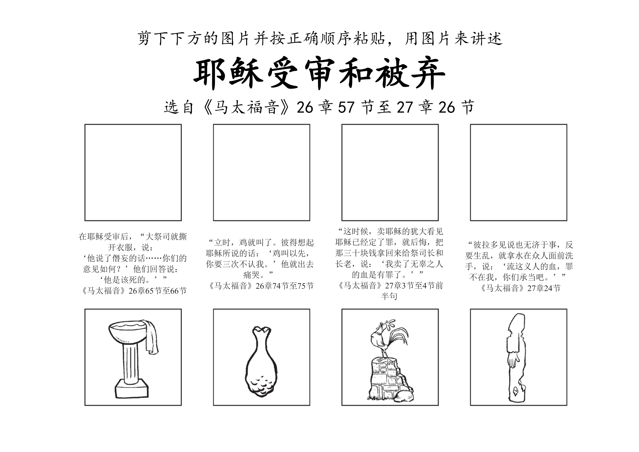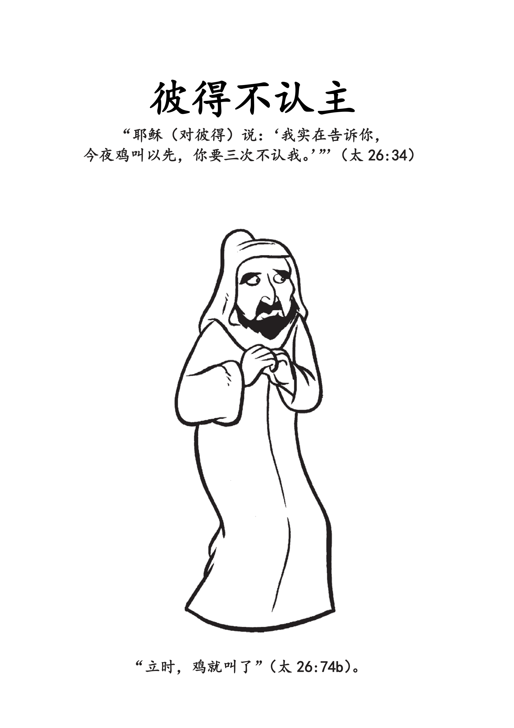 课堂说明:给每个学生一份“彼得不认主”手工页,让他们剪下每一个彼得不认主和公鸡的图片,然后用胶水把剪下来的纸片粘在另一张手工页上的彼得周围。