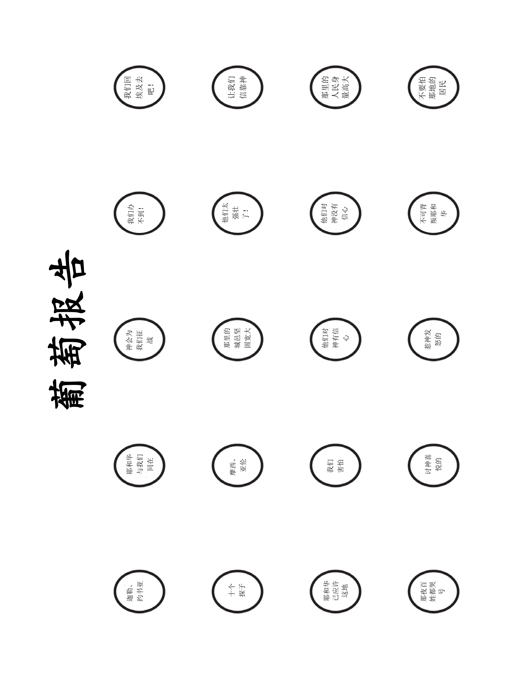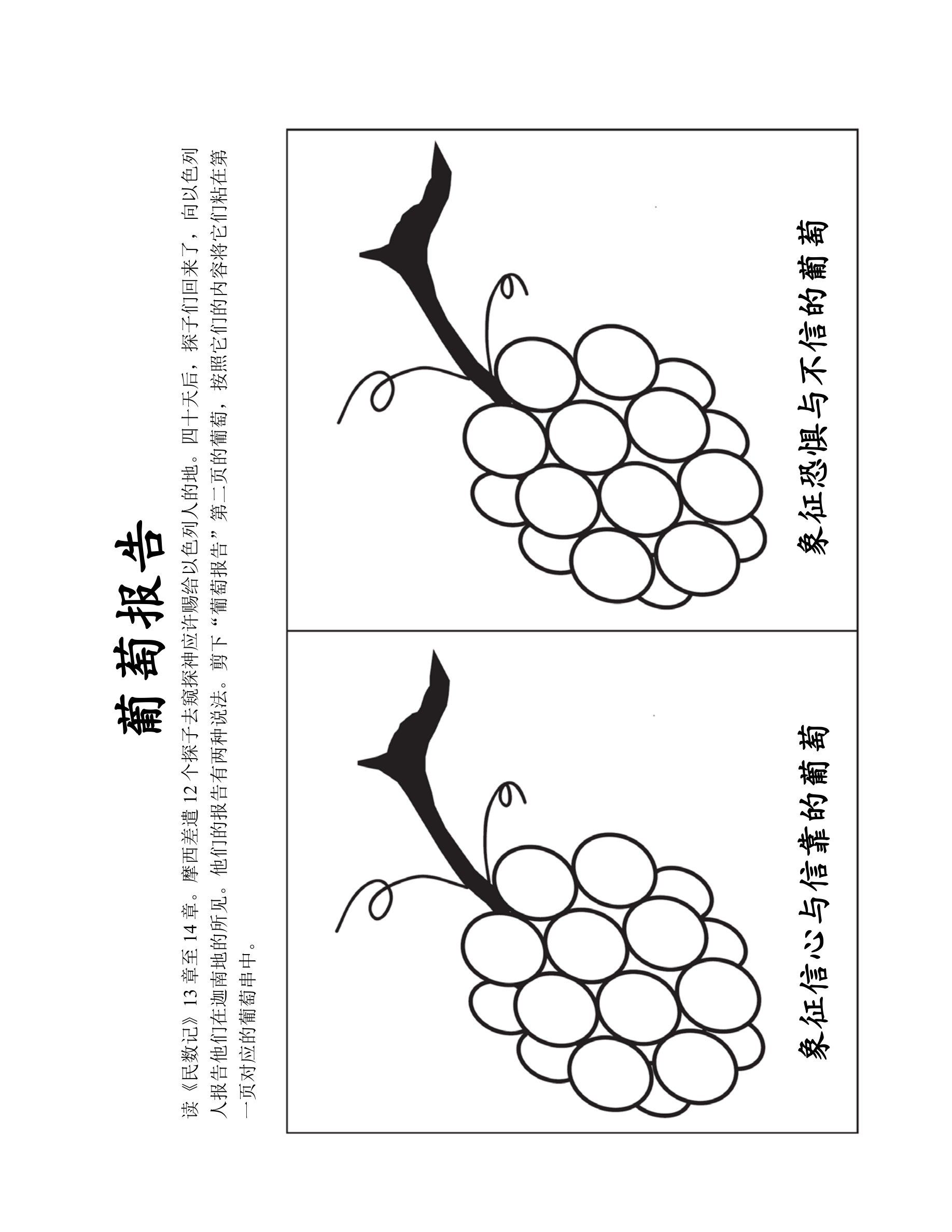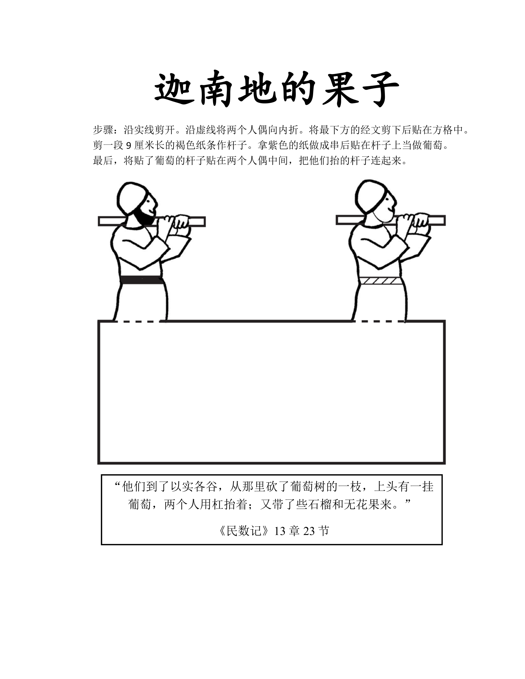 说明:将“迦南地的果子”沿着实线剪下来,将画有人的纸沿虚线折起来,将对应的经文贴在下方。剪下一个棕色的纸条代表杆子,然后将紫色的小纸团粘到杆子上代表葡萄,最后把杆子和人连接粘贴起来。