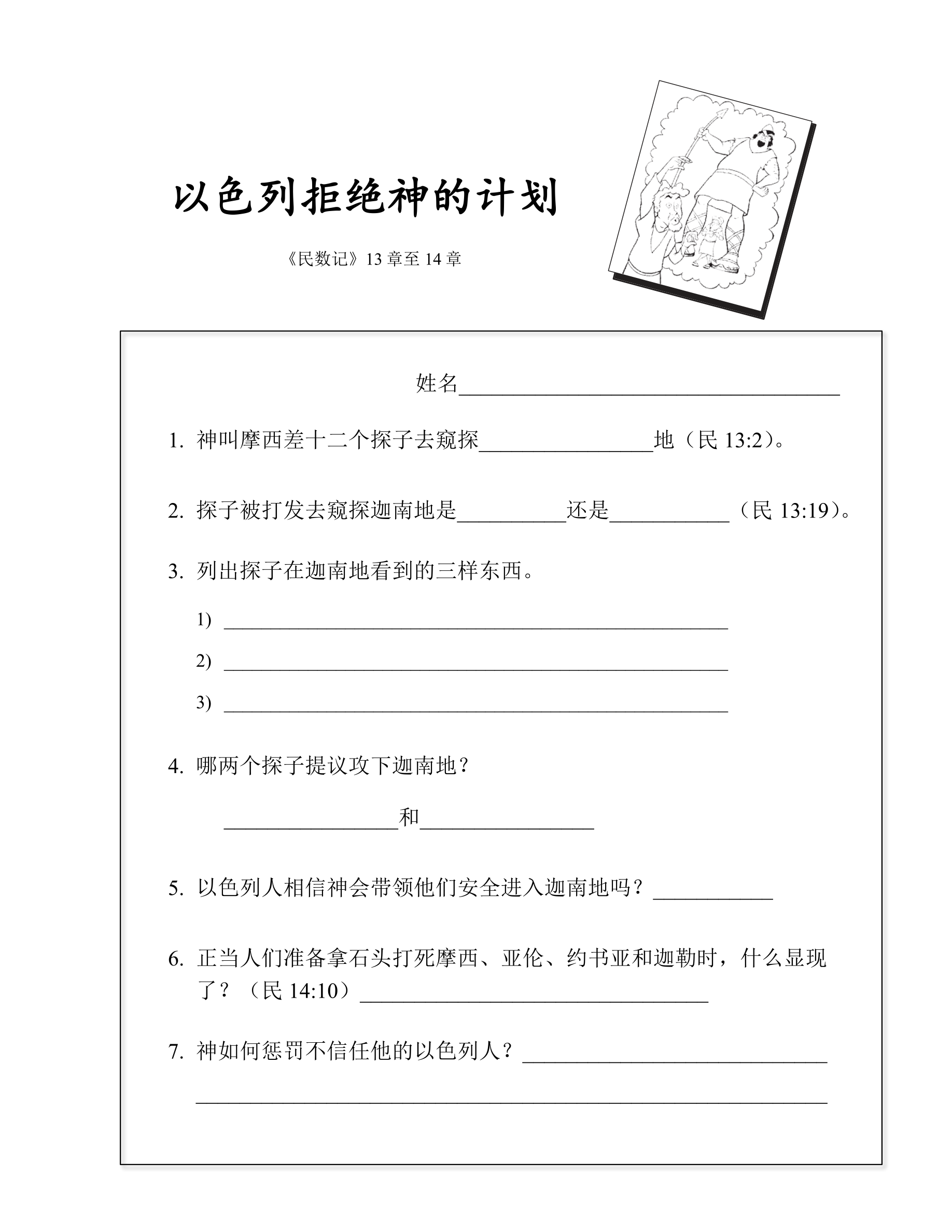 在教室的一个角落布置出一个场景或者画一幅画放在那里。上课期间允许一个孩子或者一组孩子分几次去“窥探应许之地”。给孩子们半张纸,上面写着一些开放性的问题并留有一定空白让孩子们写下他们窥探的大体情况。这个活动中基于每个孩子看到的结果所给出的答案都会不一样。过一会儿重新看一下孩子给的答案,讨论一下,为什么有时候从我们的视角看事情会和其他人的不一样。