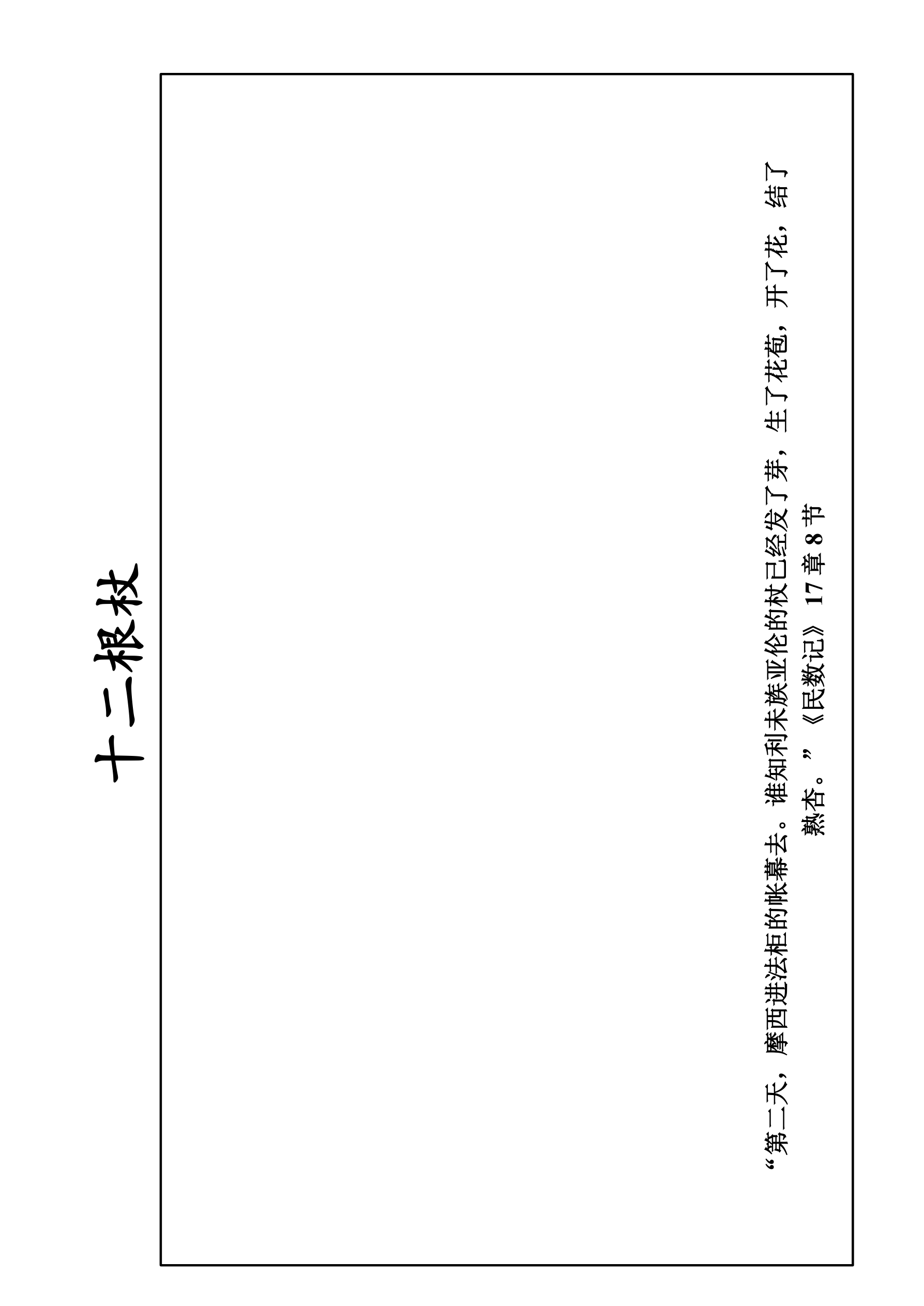 课堂说明:给每个孩子发一张“十二根杖”手工页的复印件和12根牙签代表12根杖。让孩子们将12根牙签粘到手工页上,然后在其中一根“杖”旁写上“亚伦”的名字,并用花、树叶和杏仁装饰这根“杖”。神用亚伦发芽的杖显明了他拣选亚伦作为以色列的大祭司。