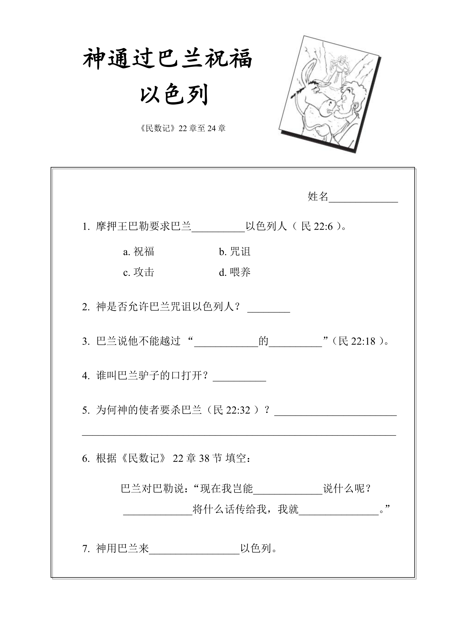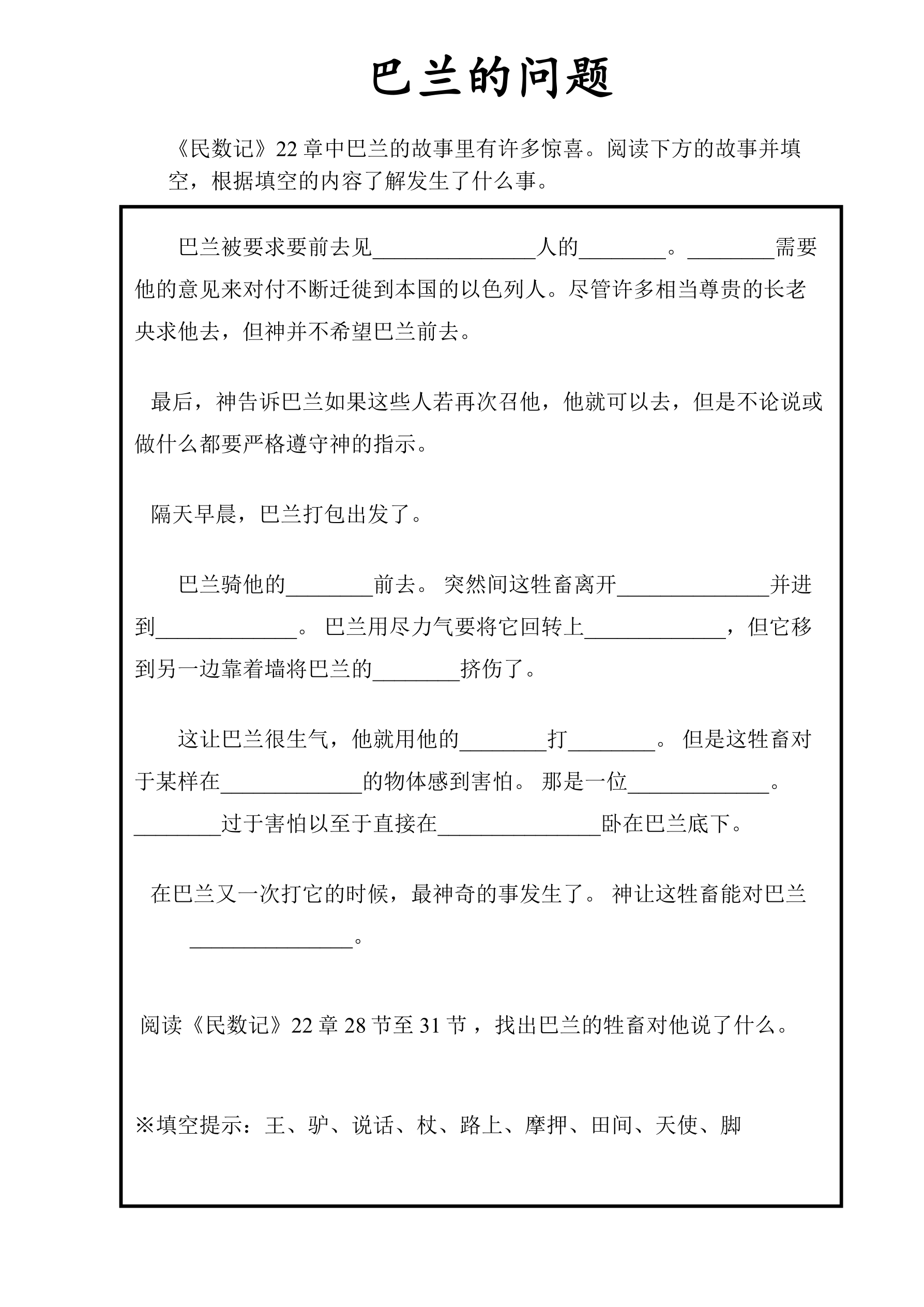 这个游戏的目的是为了表演巴兰追驴。选一个孩子扮成驴,令一个孩子扮成巴兰。巴兰必须闭上眼睛说:“驴儿,快过来——我要抓你了!”然后驴要回答道:“停下来,要不然你就要被切成两截了!”巴兰在找驴的时候,其他的孩子可以发出不同动物的声音来干扰巴兰。