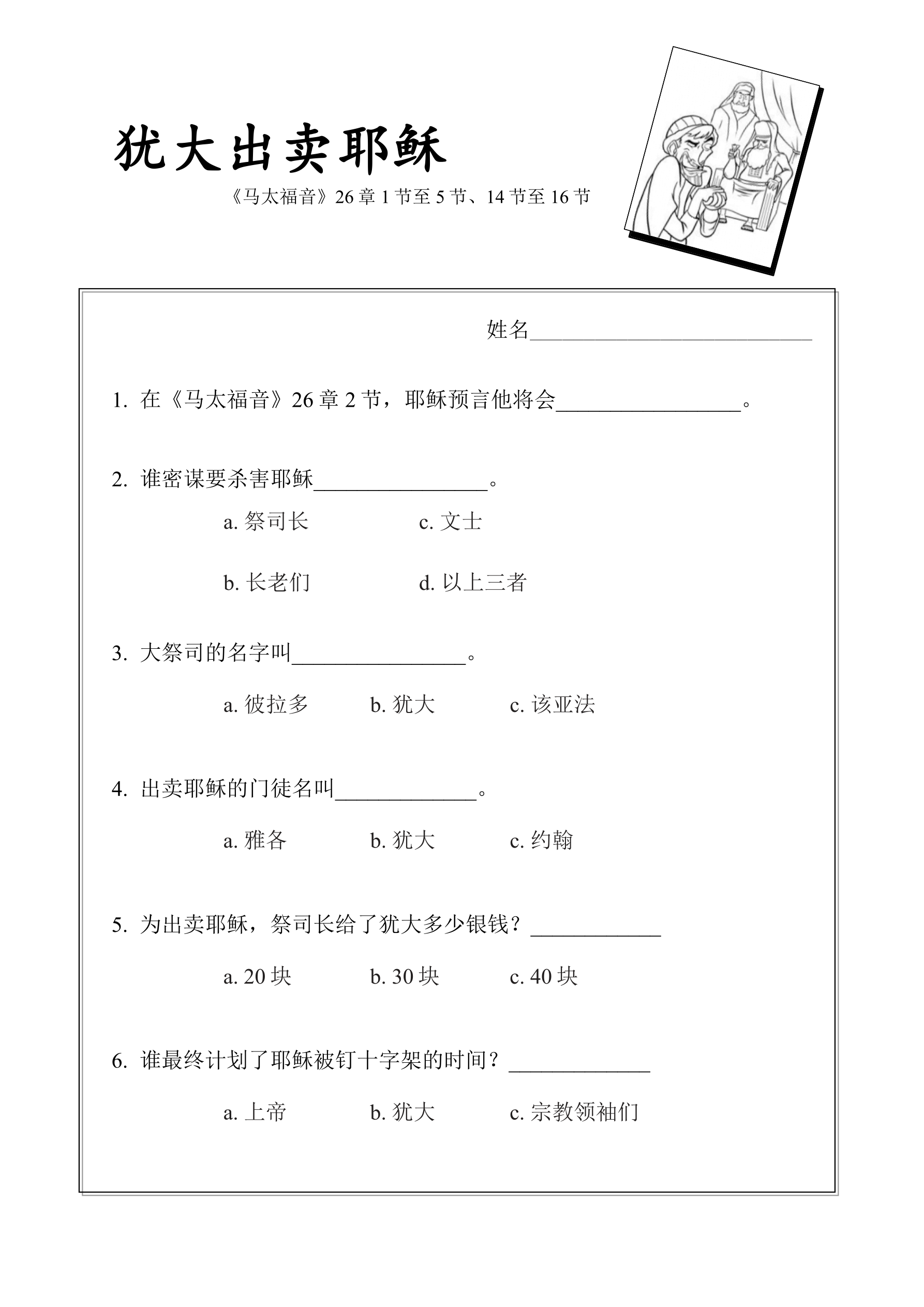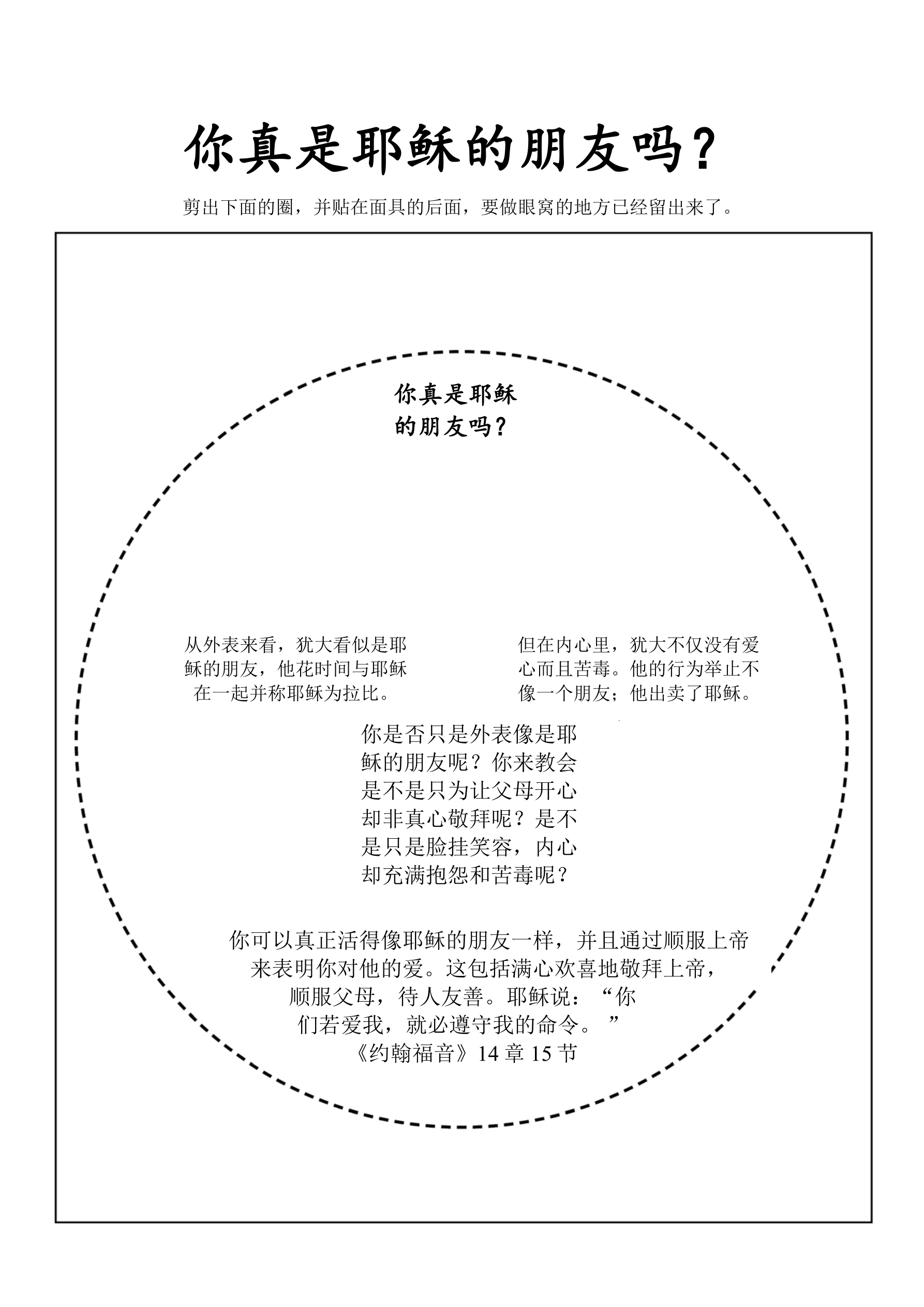 课堂说明:这个面具手工有趣的地方不在于面具本身,而在于里面的内容。让学生用纸盘或用图画用纸剪出的圆形制作面具。给他们纱钱、蜡笔和图画用纸等,让他们将面具装饰成一张笑脸。待他们完成面具后,将“你真是耶稣的朋友吗”手工页发给他们,让他们粘在面具背面。他们需要根据各自的面具大小来修剪手工纸。给学生读课文并提醒他们,装作耶稣朋友的犹大事实上是耶稣的敌人。