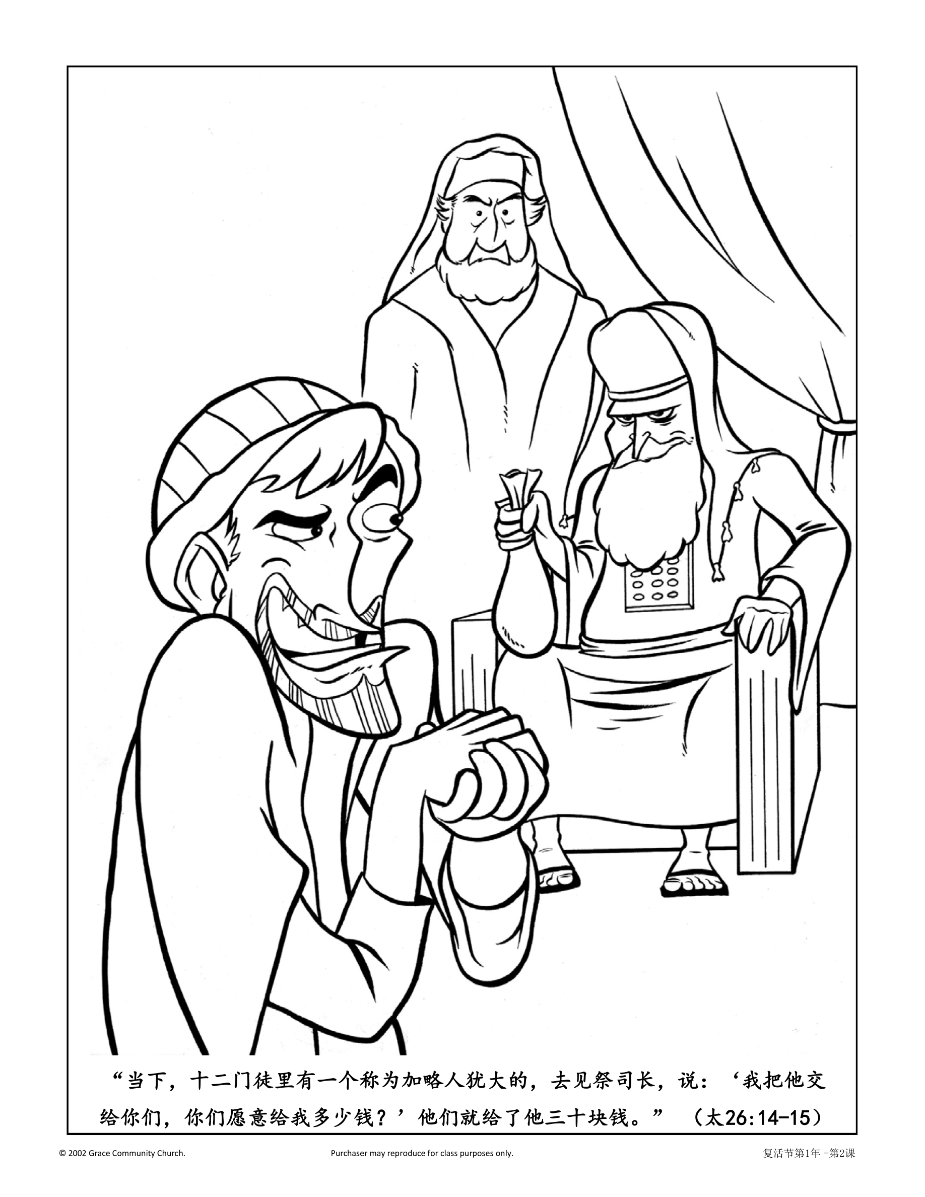 带一个装有30个硬币(道具或真币)的袋子,让每个孩子都摇一下。问他们人们是如何用钱的。如果他们有30个硬币,他们会买什么?孩子们的答案各有不同。问他们如果有人用钱来害别人该怎么办。人应该花钱请人去害朋友吗?这种花钱方式太可怕了。今天的课上,我们将学到有人花钱去害耶稣。