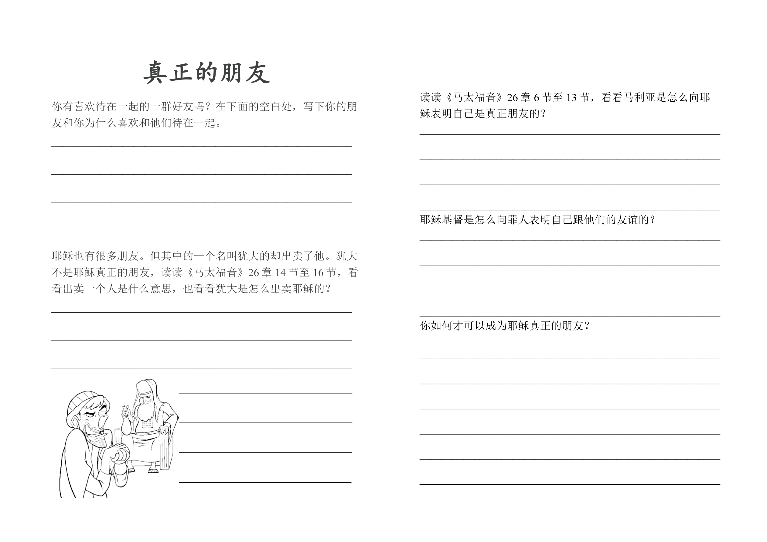 课文:你真是耶稣的朋友吗?表面上犹大跟耶稣在一起,并称他拉比,亲他的脸,很像是耶稣的朋友。但是在他的内心没有爱,只有恶毒。因此,犹大的行为并不像一个朋友,他出卖了耶稣。通过顺服神,你可以在行为举止上像耶稣的朋友一样,并且向他表达你的爱。这包括甘心乐意地敬拜神、顺服父母以及对人友善。