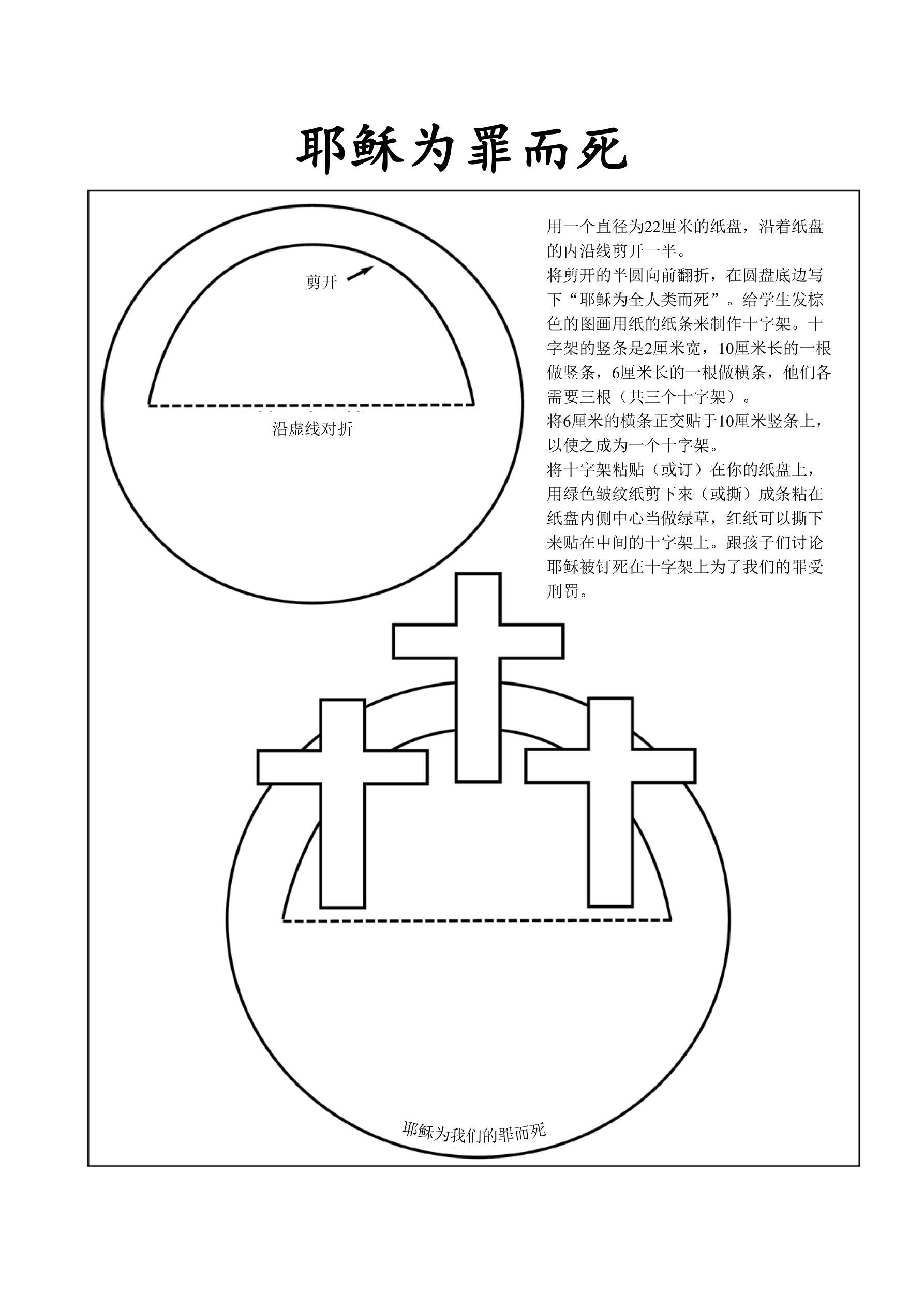 用一个直径为22厘米的纸盘,沿纸盘的内沿线剪开一半。将剪开的半圆向前翻折。在纸盘的底边写下“耶稣为全人类而死”。给学生发6张棕色纸条来做十字架。你可以用红色图画用纸制作中间的十字架。如课后内容所示,将十字架钉或者粘在纸盘上。用绿纸剪或者撕成纸条粘在纸板内侧中部做地上的草。撕一些红纸条放在中间的十字架上。跟学生们解释耶稣在十字架上受死是为我们的罪受刑罚。