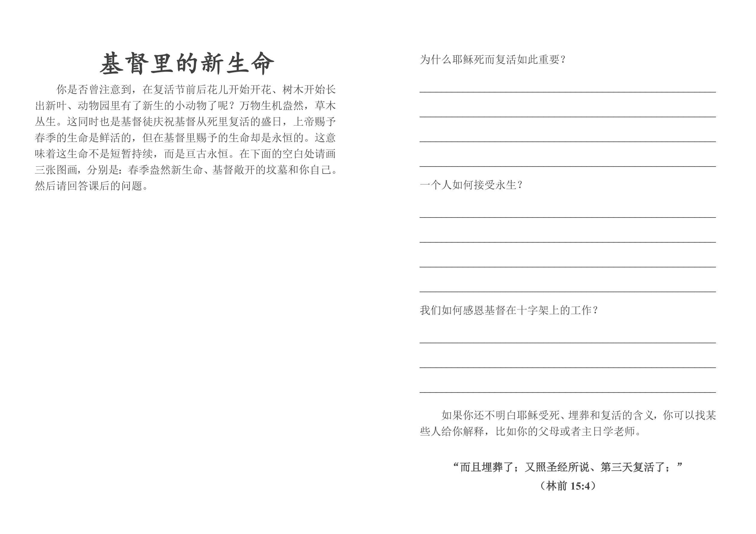 让孩子们查考《哥林多前书》15章1节至19节的经文。读这段经文并回答以下问题:耶稣从死里复活以后,谁看到了他?为什么复活很重要?