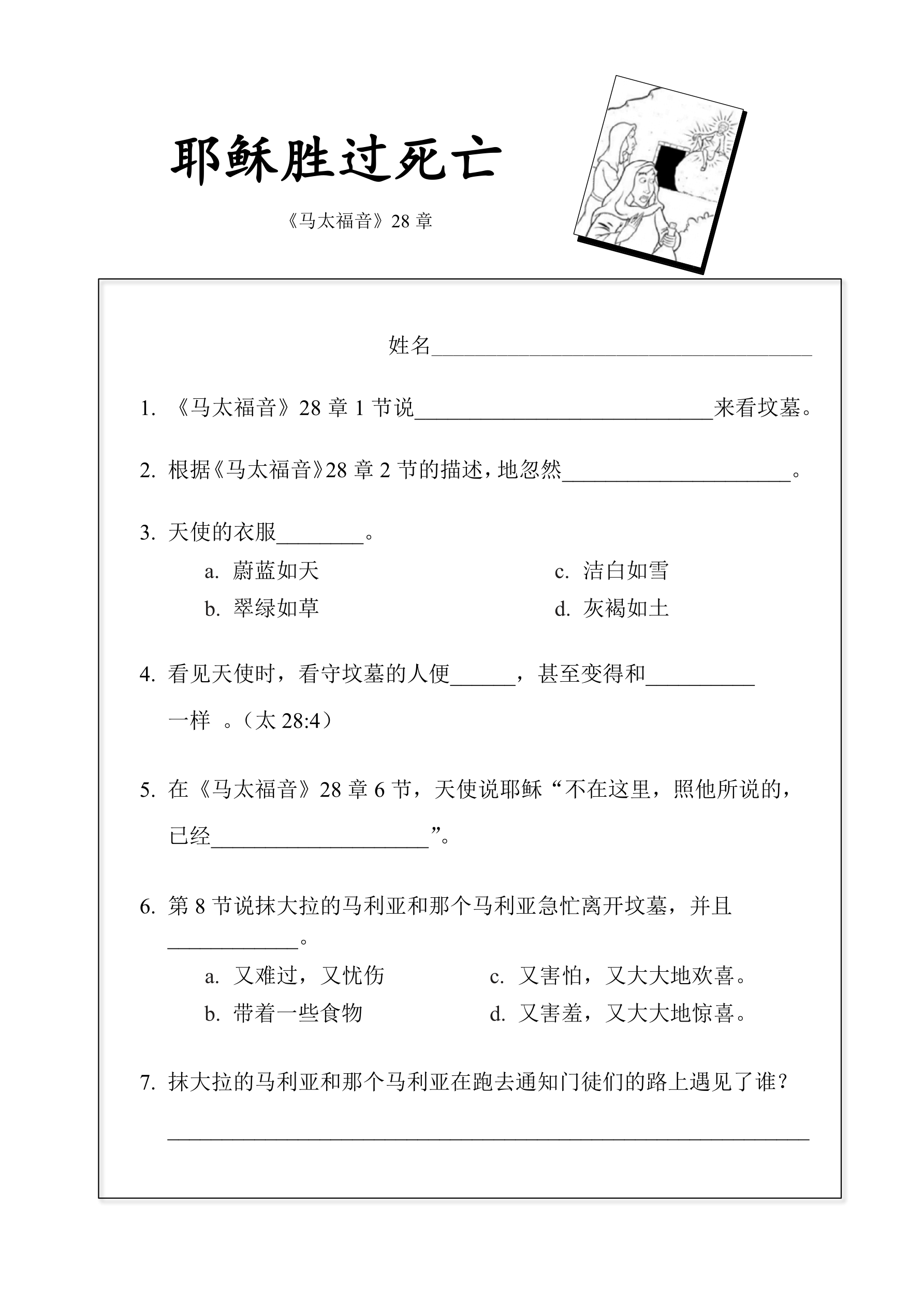 在读《马太福音》28章关于耶稣复活的描述时,我们特别注意到不同的人对此事的不同回应。看守耶稣坟墓的兵丁吓得浑身乱战,甚至和死人一样;妇人们害怕却又大大的欢喜;而祭司长却试图否认事实,并掩盖真相;有些门徒拜耶稣,还有些却疑惑。试着让孩子们明白,这些人和现在的他们一样,都知道了耶稣复活的事实,但是他们的反应却不尽相同。问问孩子们对于这件事情的反应是什么,和福音书中谁的反应比较最相似。并解释你祷告期望他们可以和故事中的妇人和耶稣的门徒一样,敬畏神,因着神欢喜快乐,敬拜神并且一生顺服神。