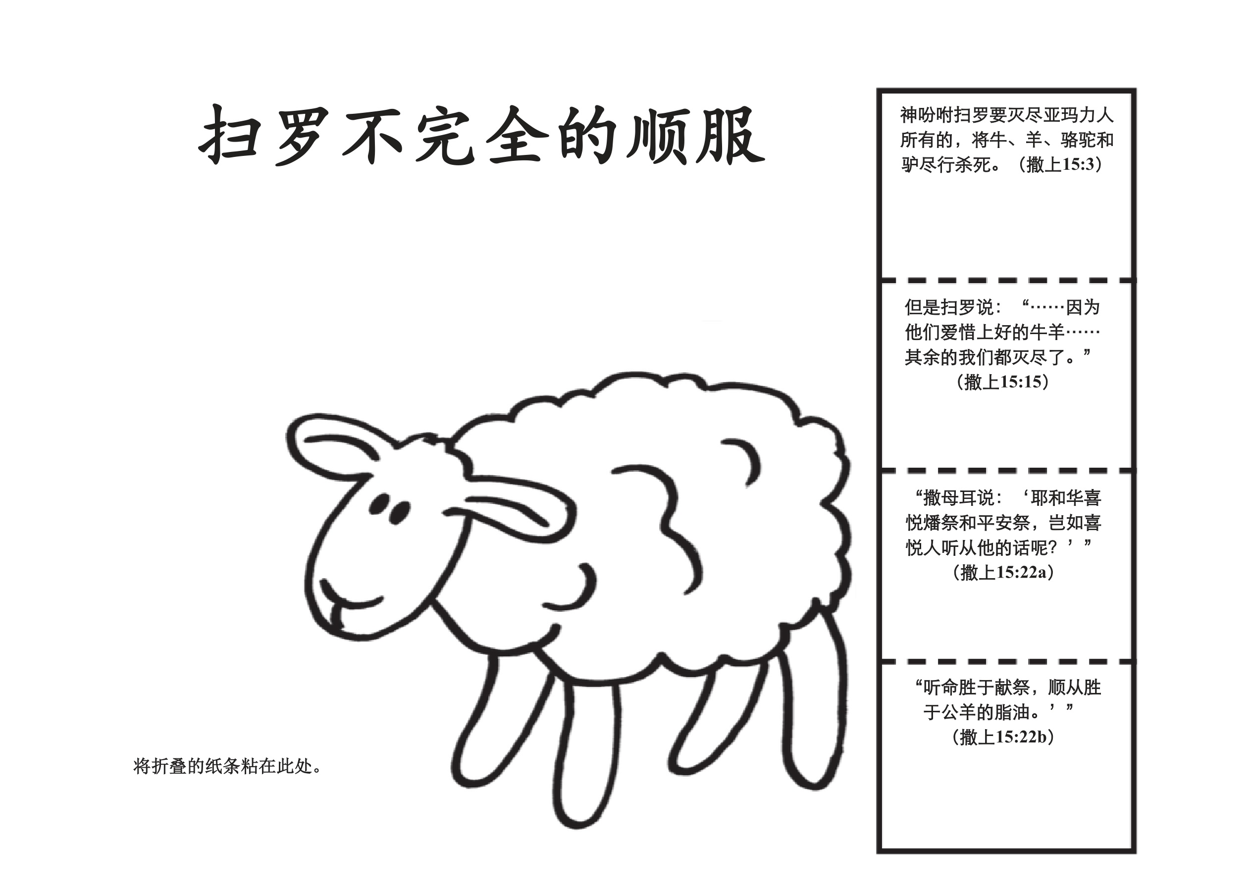 材料:“扫罗不完全的顺服”手工卡片纸数张、棉球、干草或黄色或棕色纸条、胶水和剪刀