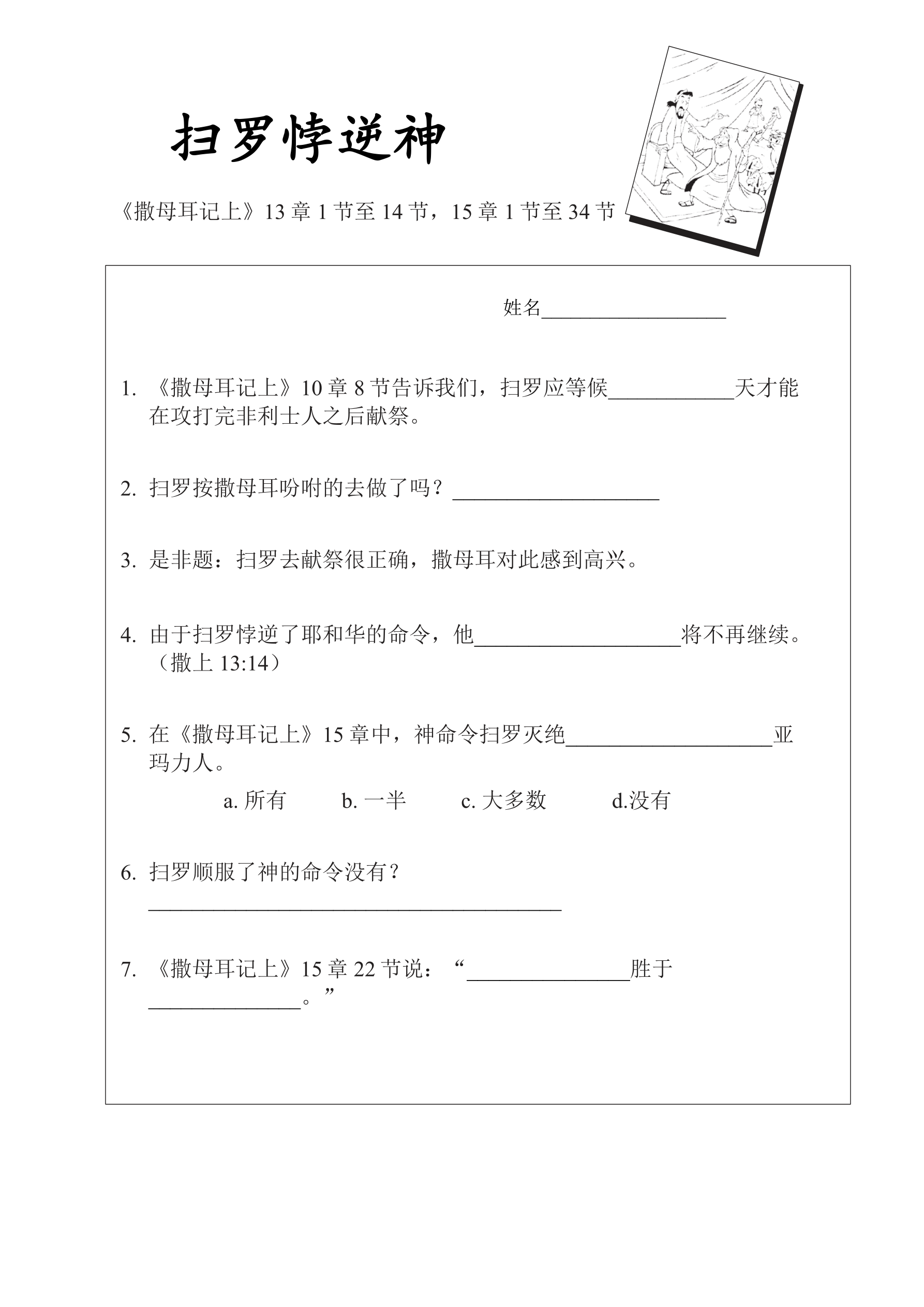 材料:准备一个装有1015件物品的袋子。收集一些学生认为有用的物品和无用的废品。有用物品范例:橡胶球、新蜡笔、小贴画、手表、硬币等。废品范例:糖果包装纸、坏杯子、用过的纸巾、没水的笔等。讨论袋子里哪些物品有用以及哪些物品需要扔掉。将物品分成两堆。但最后把两堆物品都放入袋子。此时说:“现在请大家设想,如果你的妈妈或爸爸让你把整个袋子扔到垃圾箱,这不容易做到,对吗?那么你会怎样做?在今天的圣经课上,上帝要让扫罗做一件非常不容易的事情,就好像让他扔掉很多有用的东西。让我们一同来看看扫罗最终是怎么做的。”