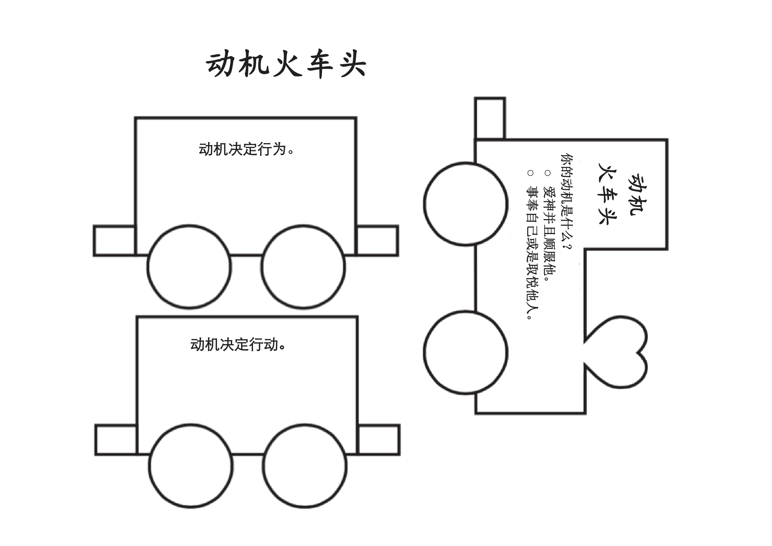 说明:让学生先给火车部件涂色,然后把这些部件剪下,并用平头钉把各节车厢连起来组装成一辆火车。