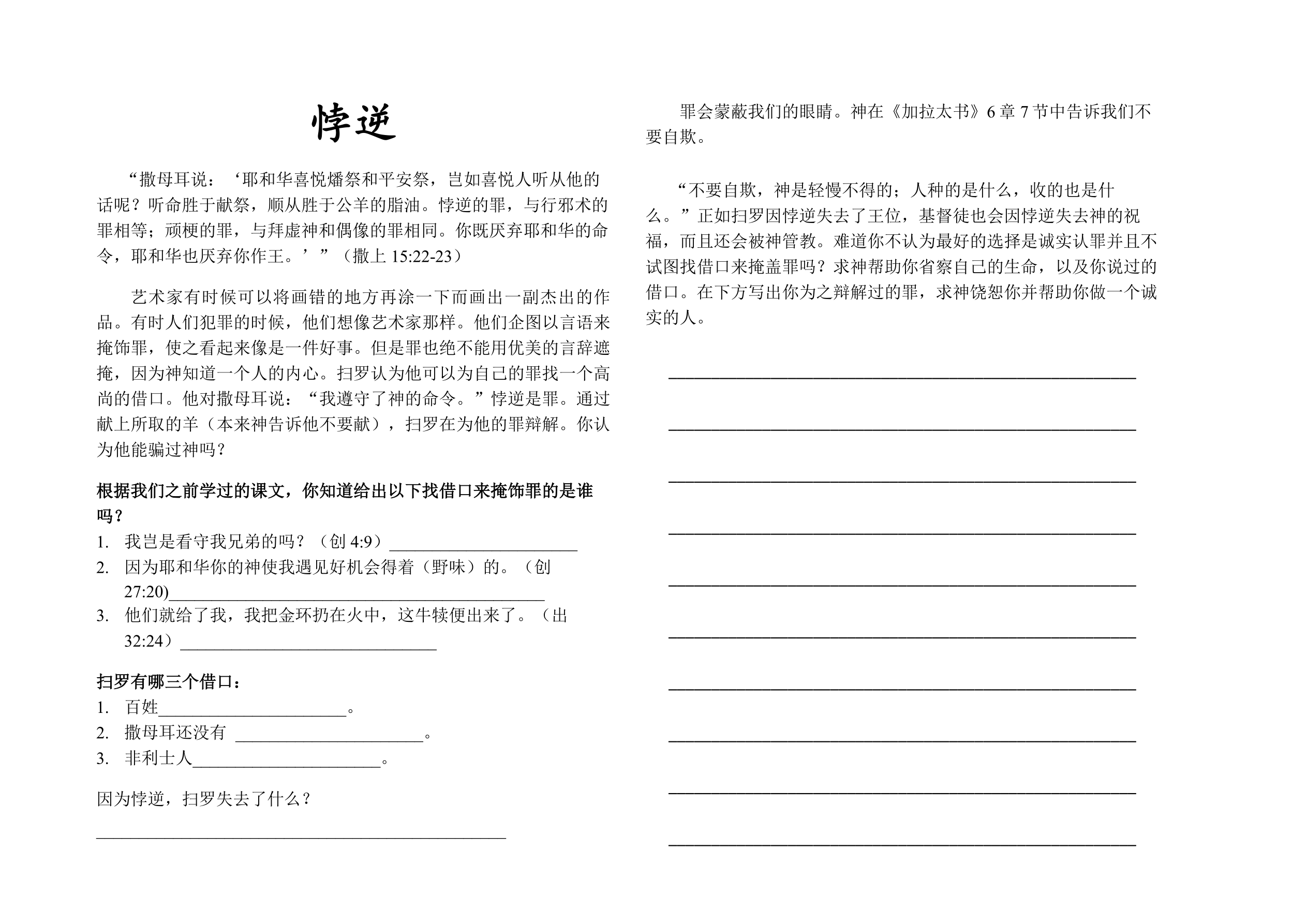 人人都知道他们应当顺服神,也知道神许可他们作什么,禁止他们作什么。但是,每个人都能够时时顺服吗?不能!我们悖逆的次数太多,以至我们都忘记了自身的罪性,看不见悖逆的乖僻所在。在今天的课文中,我们将看见扫罗悖逆神的下场。