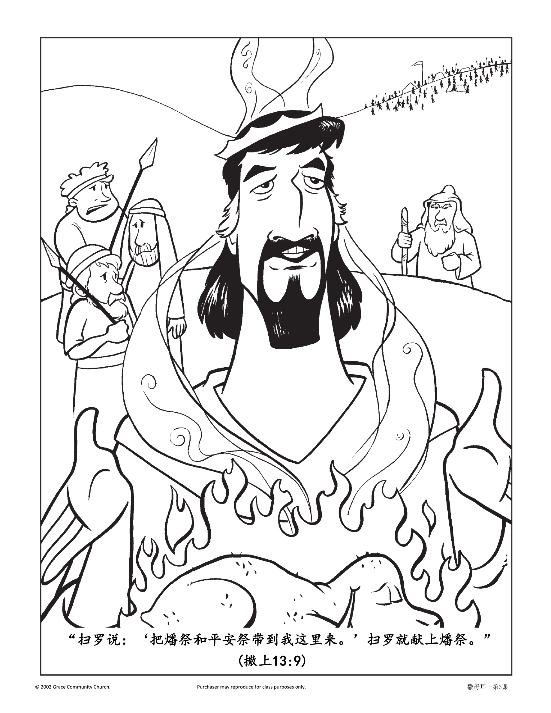 我们不知道扫罗具体在何事上犯罪。他不大可能因为献祭犯罪,因为后来大卫和所罗门都献过祭,他们并未因此遭到指责(撒下24:24;王上8:62-64)。扫罗犯罪很可能是因为他没有等待撒母耳。扫罗很快为自己找了三个理由:百姓四散;撒母耳没有按着指定的时间出现;非利士人的威胁近在咫尺(撒上13:11-12)。扫罗不愿“没有祷告耶和华”就面对敌人,但他因为“勉强”(撒上13:12,英文作“不得不”)献祭而得罪了神。扫罗过于重视自己的理解和需要,而忽略了神的话语。
