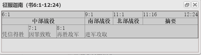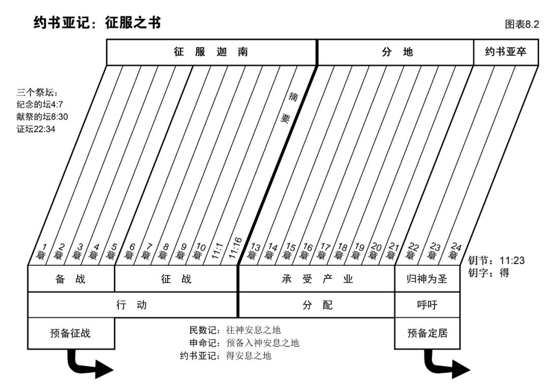 约书亚记的写法就是按照上述策略,将征服迦南的主要战事顺次写下。图表8.5就是本段的大纲。请照这个分法读该段经文。