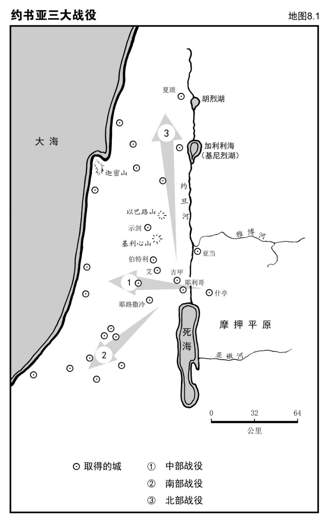 读约书亚记之前,我们先看看书中的地理形势。地图8.1箭头标明以色列军攻入迦南的三场战役。