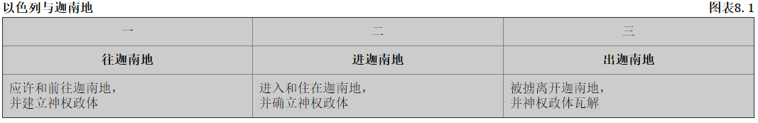 读者若能了解约书亚记在旧约以色列史中的地位,便较易明白该卷书。简单来说,旧约以色列史可分为三个时期。按图表8.1所提示,那三个时期均环绕着一个地方(迦南)和一个政权(神权政体,以神为统治者)。