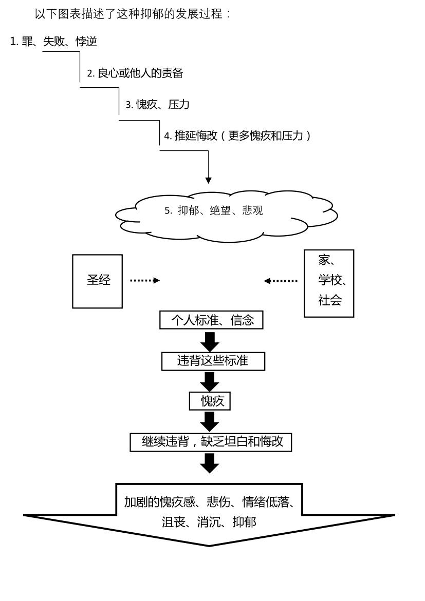 抑郁也许是一个人生活中有未解决的罪和愧疚的结果。通往这种抑郁的路径常常是这样: