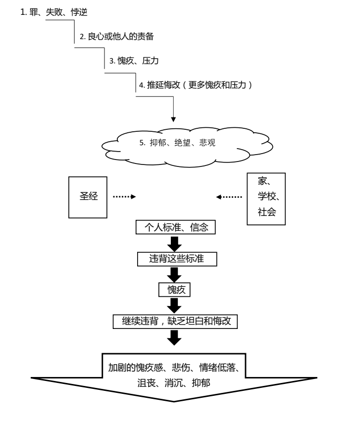 抑郁也许是一个人生活中有未解决的罪和愧疚的结果。通往这种抑郁的路径常常是这样: