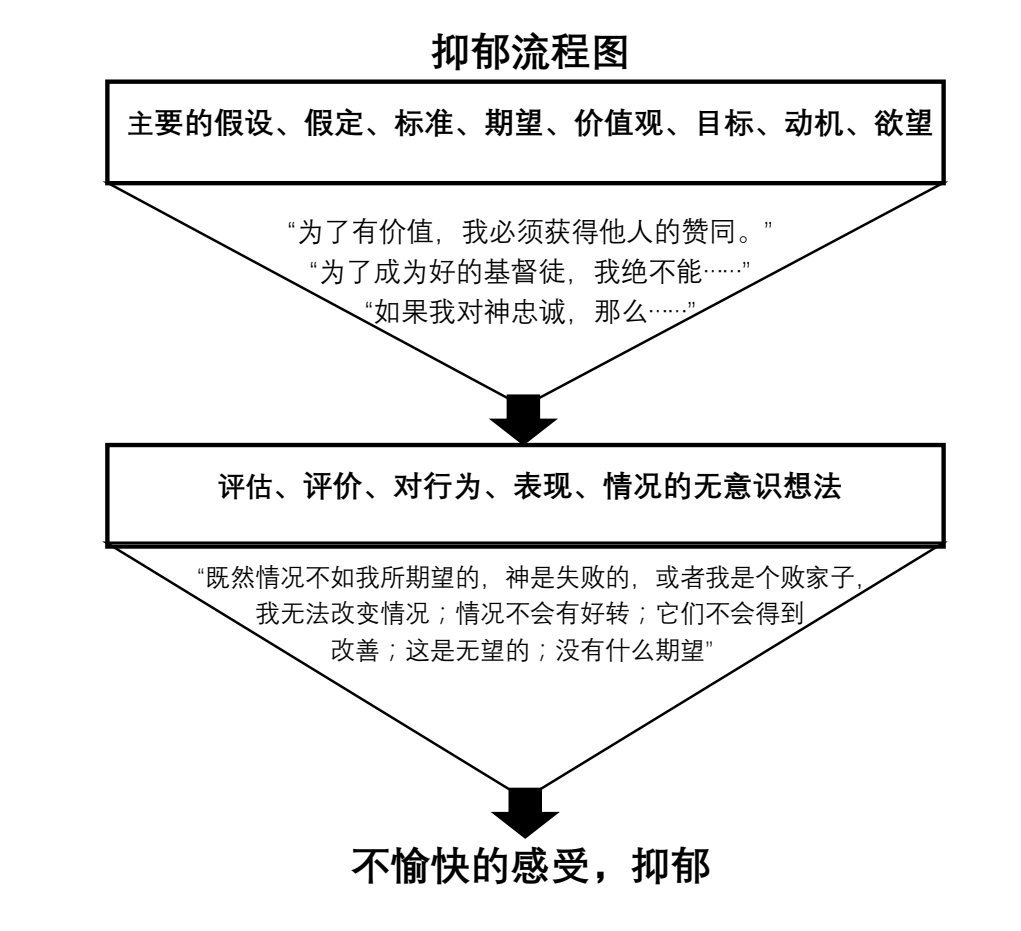我辅导过很多抑郁的人,他们的抑郁是由不符合圣经的标准和价值观所导致。当他们把自己与世人的价值观相比时,他们就觉得自己有严重的缺乏,并因此没有价值。如果约翰·班扬像他们那样做,我们就很可能没有他在狱中所写的《天路历程》这部伟大寓言以及其他著作。班杨在狱中待了十二年半,那时他的家人贫苦,因为他拒绝采用世人的标准。他没有变得抑郁或苦毒,而是专心地学习圣经并让神通过他的苦难带来益处。采用世人的思考方式是引向抑郁的道路,而定睛于耶稣却无疑是脱离抑郁的出路。