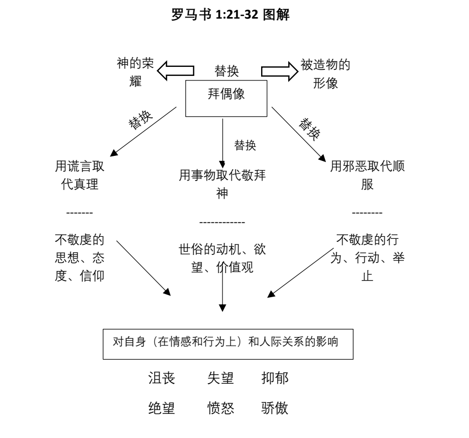 图表2表明,当我们拒绝用符合圣经的角度看待什么是重要的,并用世俗和魔鬼的价值观取代在神看来真正有价值的东西时会发生什么。图表本身是对罗马书1章21-32节的展现,它描述了当人们转离神给他们的生活目的(荣耀神并永远以祂为乐)并转向被造物及其价值时,他们在情感和行为上会发生什么。