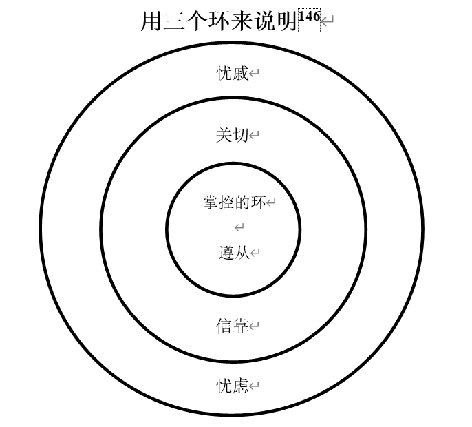 [1] 三个环的模型是尼古拉斯•艾伦根据保罗•区普的一篇文章改进的,区普写到:“界定责任也很重要。很多被辅导者都困惑于他们需要和不需要对什么负责……大多数和我做了这个区分的人都觉得很有帮助。我把之简化为‘我们每个人在生命中都有两个环,最里面的小环是责任,较大的一个大环是关切。责任的环包含神呼召我们去做的所有事。在这个里面我们被呼召去遵从。这些责任我们无法推卸给别人。他在神命定我们所在的处境中对我们是命令。第二个环是你所关切的。在这个环里包含那些对我们很重要并且是我们每天都关注但却不是我们造成也不是在我们掌控之下的事情。这些事我们必须交托给神。我希望你们能把生命中的事情放置在合适的环里。这也清楚的显明了愤怒、焦虑、惧怕、操纵、被动和很多其他罪的根源。试图掌控你被呼召去信靠的,却不能遵行你被呼召去遵从的,是各样恶事的根。”(Paul Tripp, "Homework and Biblical Counseling, Part2," The Journal of Biblical Counseling: Volume 11, Number 3, Spring 1993 (Glenside, PA: CCEF), 17). 尼古拉斯•艾伦引入了第三个环的概念。他称之为“忧戚”(因为耶稣在马太福音6章、以及路加福音12章教导我们“不要忧虑”。忧虑就是指生活中任何不必要的担忧。换句话说,你一旦被所忧虑的事情掌控了,你的内心就会进入忧戚)。你越对那些无法掌控的事情产生忧虑,就越离神要求你负责任地去掌管的事情越远。