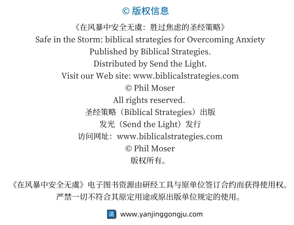 对神不断增长的认识和信心是胜过焦虑的关键。需要格外留意神的三个属性:他的慈爱、大能和智慧。我在这里给出一个28天读经计划,为了便于记起经文,我列出20段背诵的经文,是直接应用于焦虑和忧虑的。