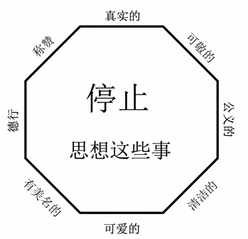 腓立比书4:8为我们应当思想什么提供了一个绝佳的提醒。思想经文中所列出的八种品质,并画一个八边形的停止符。然后,操练让你的思想专注在这些标准里。如果你的思绪出了这个范围(例如,担心将来的一件事或挑战),把你的思绪拉回来,并回顾这八种品质。也许列一个表格会有帮助,用圣经的词来做标题,列出那些真实的、可敬的、公义的等等的事情。