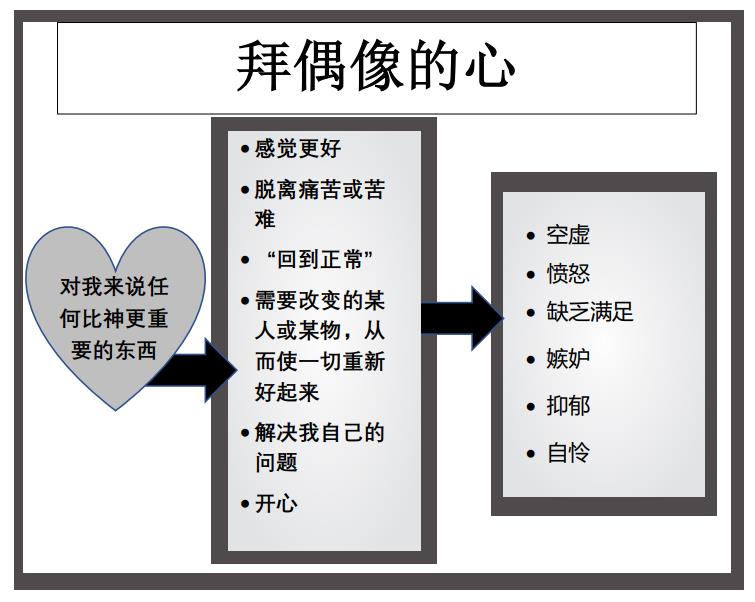 在我们想要解决生命的问题、促使人改变时,处理心中的偶像是最核心的问题。跟其他要处理的罪类似,偶像崇拜也是心的问题,属于非物质的部分要解决的问题。心包含了想法、信念、欲望、心志、意愿和情感。 因此,心就是我们生命的信息处理中心。根据耶利米书17章9节所说,人的心充满了诡诈和败坏,罪性使我们要为之争战,同时罪性又充斥在情欲之事里。