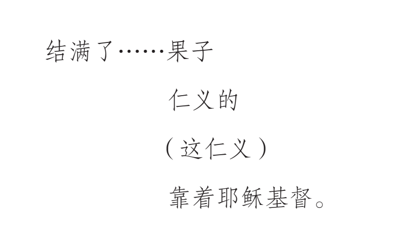 5.“靠着耶稣基督”(11节)。果子靠着耶稣基督而来,还是仁义靠着耶稣基督而来?原有的结构图显示是果子靠着基督而来。选择这个解释是根据希腊原文的语法结构,而另一个不正确的观点是,保罗在这里是指靠耶稣的义,那么结构图应该是这样的: