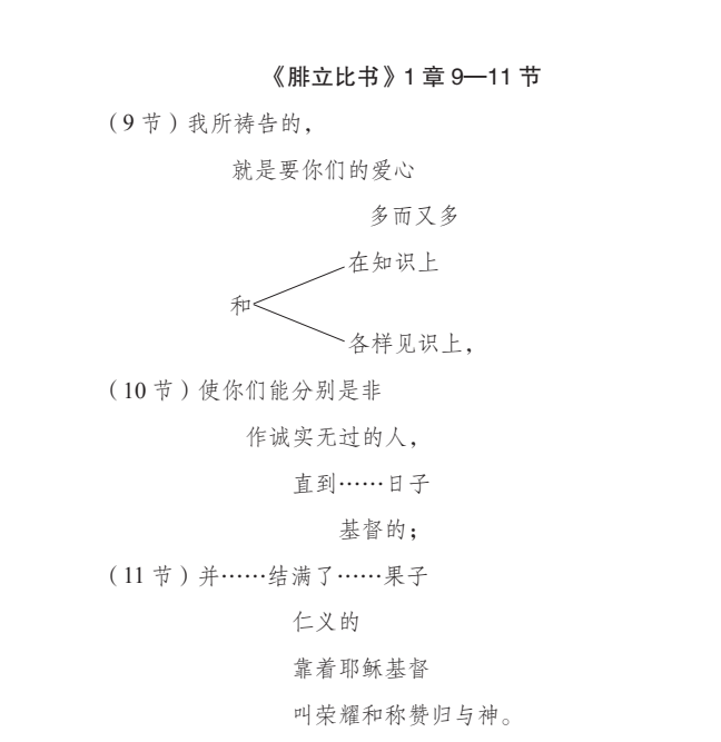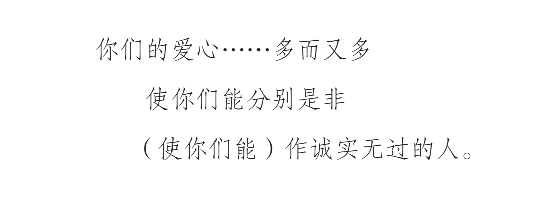 3.“(使你们能)作”(10节)。结构图显示“作诚实无过的人,直到基督的日子”是“能分别是非”的结果。但如果保罗的意思是“直到基督的日子”的这种良好状态是爱心多而又多的结果,那么,这个短语就应该与上一短语“能分别是非”并排: