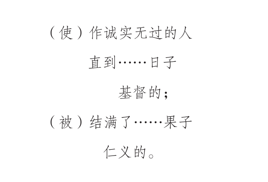 在原文结构图中,“结满了”和“作诚实无过的人”并排,且位居“能分别是非”以下,意思是指结满了仁义的果子是能够分别是非的先决条件。这句话可能解读为:“在结满了仁义的果子之后,你们就能分别是非”。但经文的意思还可能是:“他们会诚实无过,因为他们被结满了仁义的果子”。