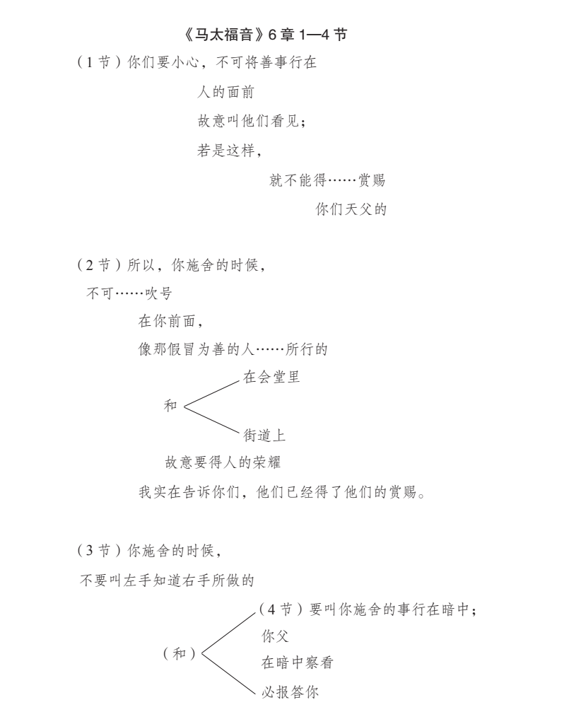 你们既然已经查考了结构分析的过程,在分析下一个较为复杂的例子之前,找一段你特别感兴趣的简单经文练习一下,会大有裨益。