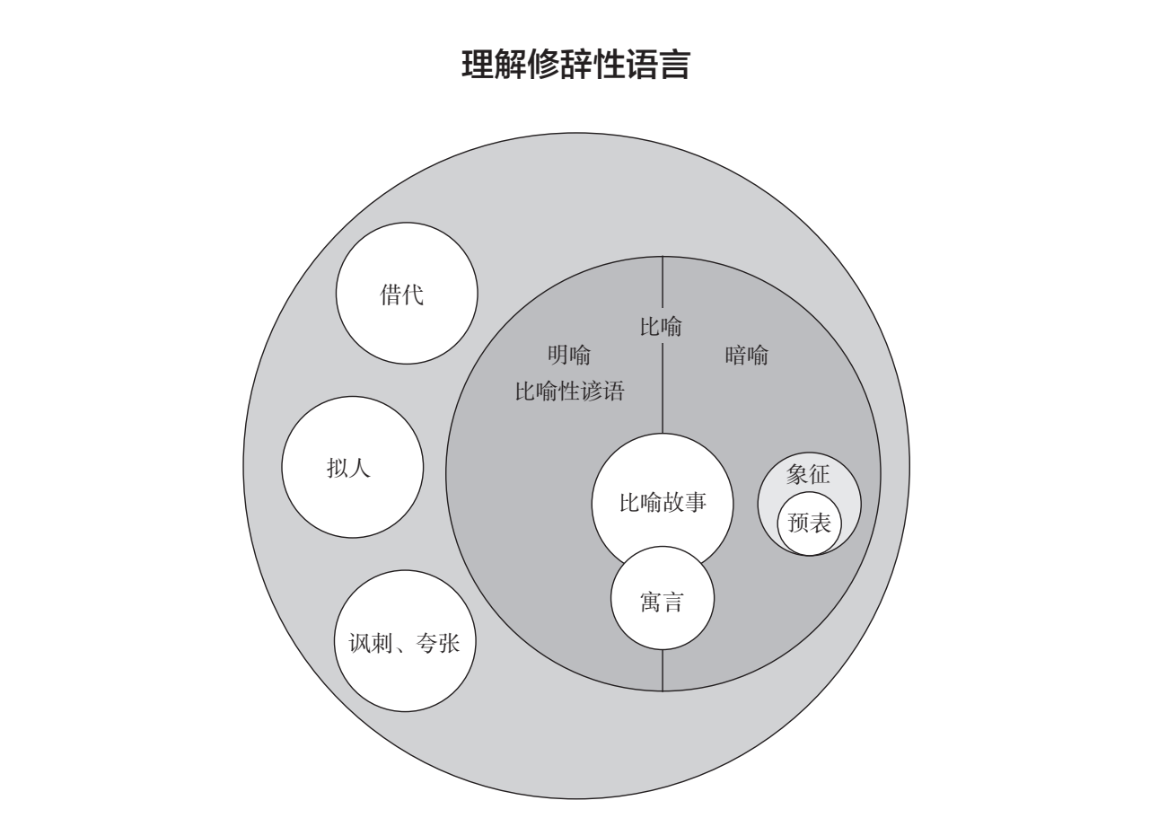 人类语言充满了非字面意思的表达,而且东方语言中的修辞尤为丰富,因为这些语言对我们来说是陌生的,所以我们就更应该努力明白作者真正要表达的意思。我们除了要面对语言、文化差异的障碍,还有修辞性语言的障碍。试想一位外国人努力尝试领会英文单词hang(悬挂)的窘境:这个词字面意思的定义容易找到,但作为一个外国人,当他听到别人说他有许多hang-ups(感情上的烦恼),应该hang loose(放松点儿)并让自己的真实感受hang out(尽情表达)时,他该做何感想?即便他仔细研究了这些习语,可能还是会感到纳闷:为什么某人缺席是因为hang over(昨晚喝多了),或为什么有人告诉他虽然在语言理解上存在很多障碍,但他不但应该hang on(等待),而应该hang in there (坚持到底)。修辞性语言通常是用来强调某个观点。耶稣说“你们去告诉那个狐狸”(路13:32),要比说“去告诉那个王”更有威力;他说“若一个人不恨自己的父母”,要比“你们要爱我胜过爱自己的父母”强烈。修辞性语言能给人留下更深刻的印象。