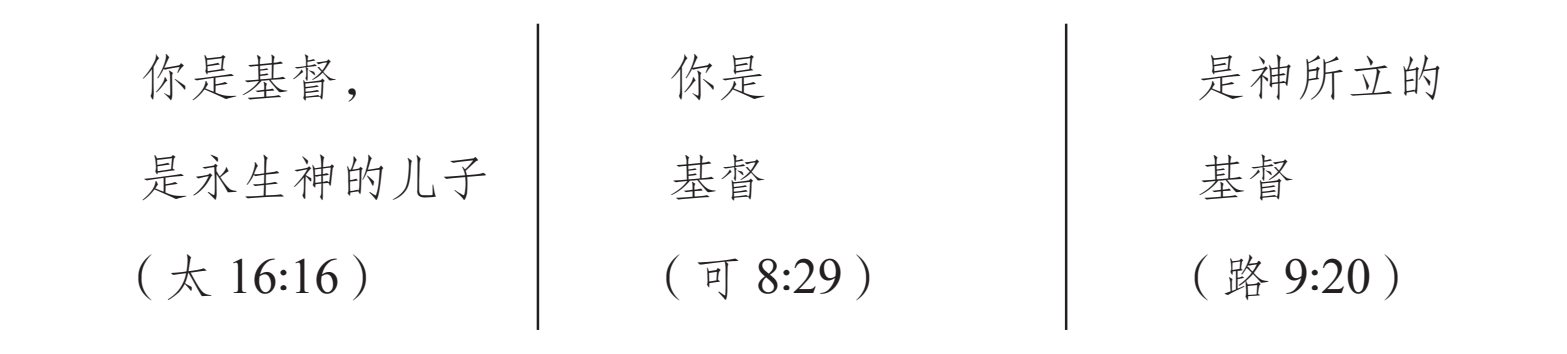 这其中有两个引用是错误的吗?不,因为彼得所认信的是一样的。马太显然引用得较为全面,马可引用了要点,而路加则引用了一个总结,但三个引用都是真实的。