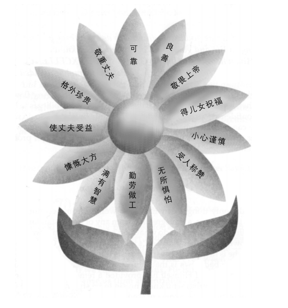 神在《箴言》31章10-31节里,描述了才德妇人的20个特征,也可以称为美德。当这些美德在一个妇人的心中扎根之时,她的生命就开始荣耀神了。就像沐浴在清晨阳光下的美丽花朵,它的存在彰显出神创造的荣耀,贤德的妻子同样用她的态度和行为荣耀了神。她身上所拥有的特质是这样的: