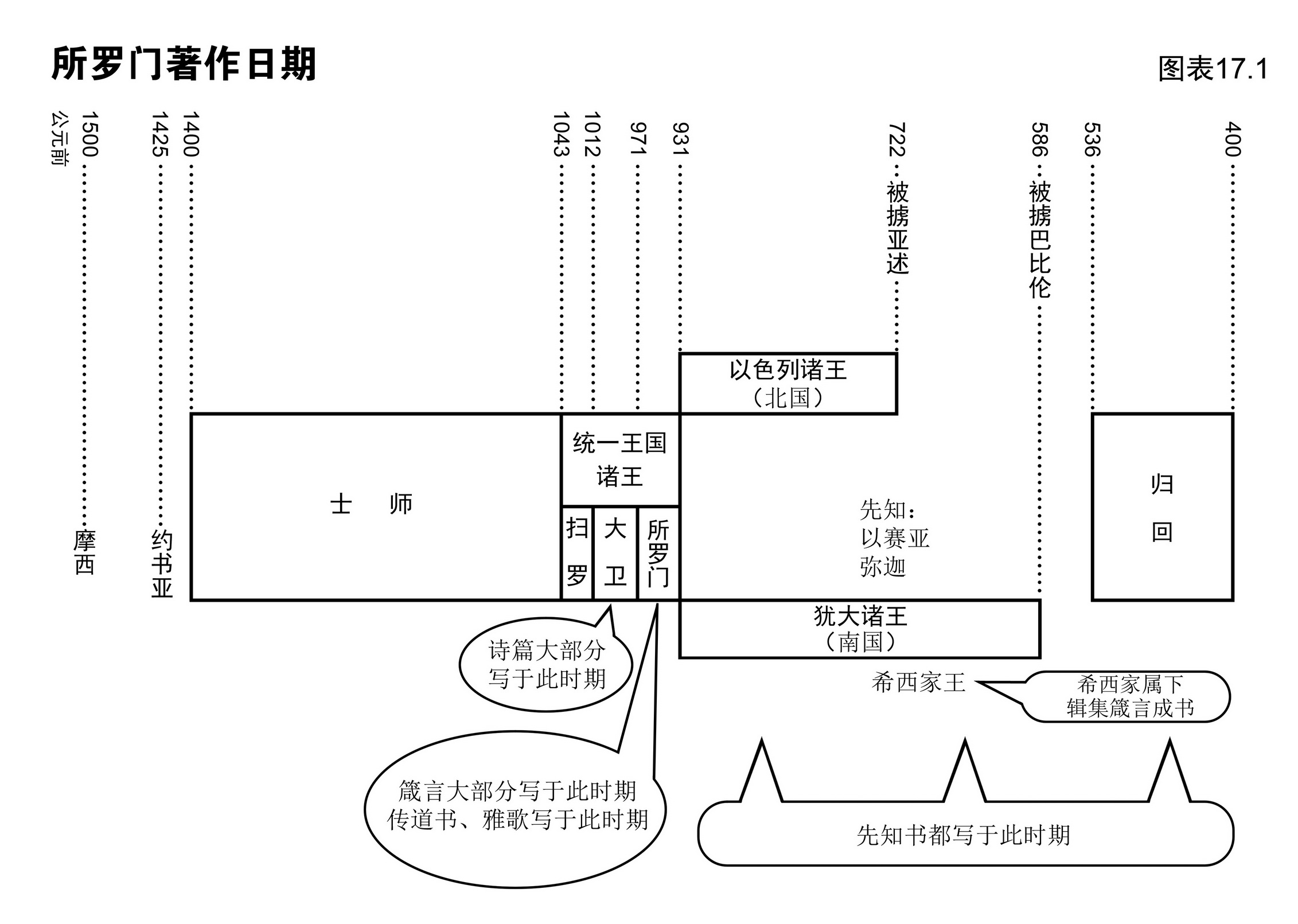 卷四 先知圣工 圣经中先知书共十七卷,由十六位先知所写,因为耶利米除了写耶利米书外,还写了耶利米哀歌。根据篇幅的长短,先知书又分为大先知书与小先知书。自公元前840年(俄巴底亚书)至公元前420年(玛