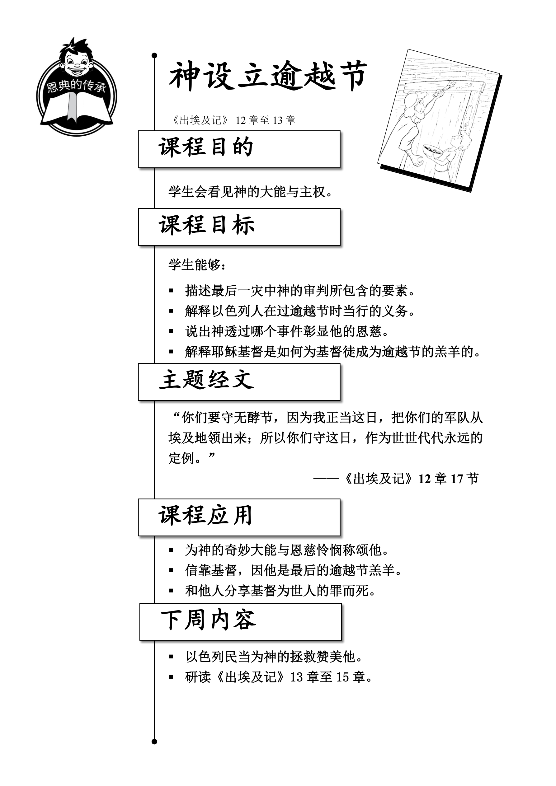 第4课:神设立逾越节 预备真理 “你们要将我这话存在心内,留在意中……也要这样教训你们的儿女……”——《申命记》11章18节至19节 请花时间来准备你的心思意念,按着正意分解真理的道(提后2:15)。