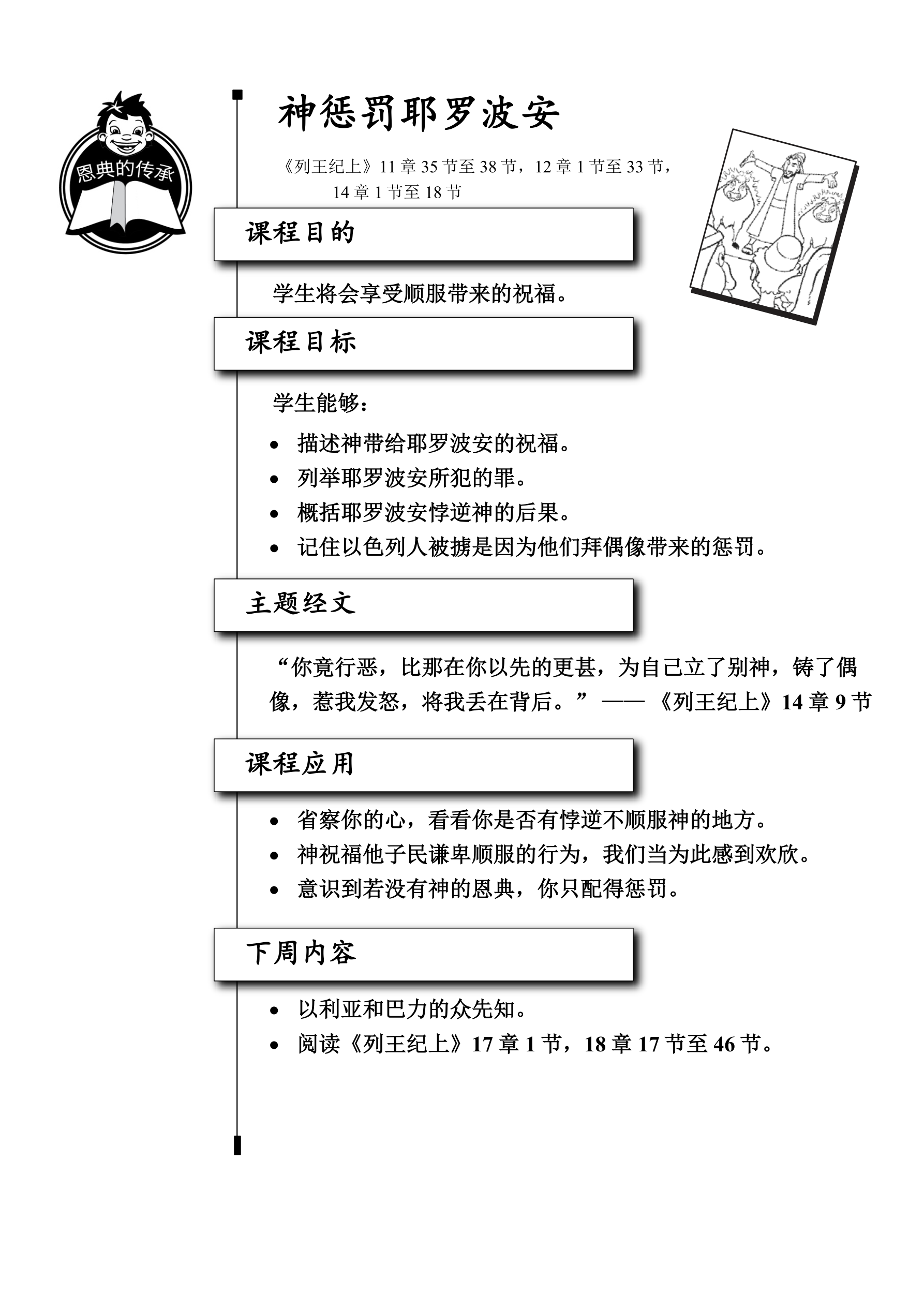 第4课:神惩罚耶罗波安 预备真理 “你们要将我这话存在心内,留在意中……也要这样教训你们的儿女……”——《申命记》11章18节至19节 请花时间来准备你的心思意念,按着正意分解真理的道(提后2:15)