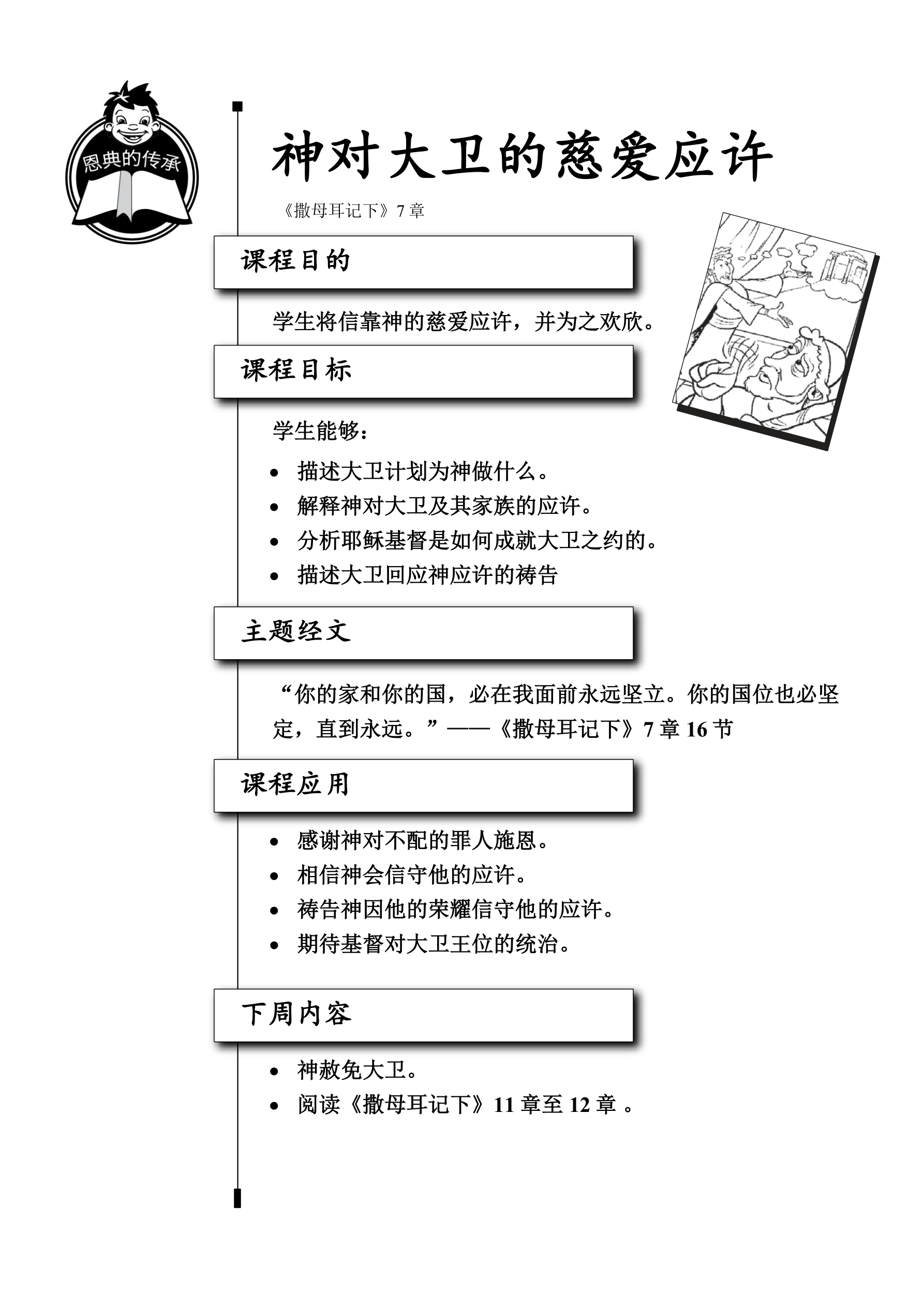 第9课:神对大卫的慈爱应许 预备真理 “你们要将我这话存在心内,留在意中……也要这样教训你们的儿女……”——《申命记》11章18节至19节 请花时间来准备你的心思意念,按着正意分解真理的道(提后2:1