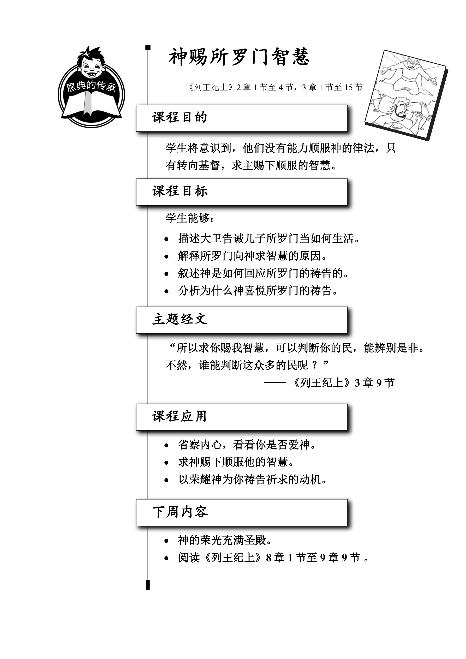 第1课:神赐所罗门智慧 预备真理 “你们要将我这话存在心内,留在意中……也要这样教训你们的儿女……”——《申命记》11章18节至19节 请花时间来准备你的心思意念,按着正意分解真理的道(提后2:15)