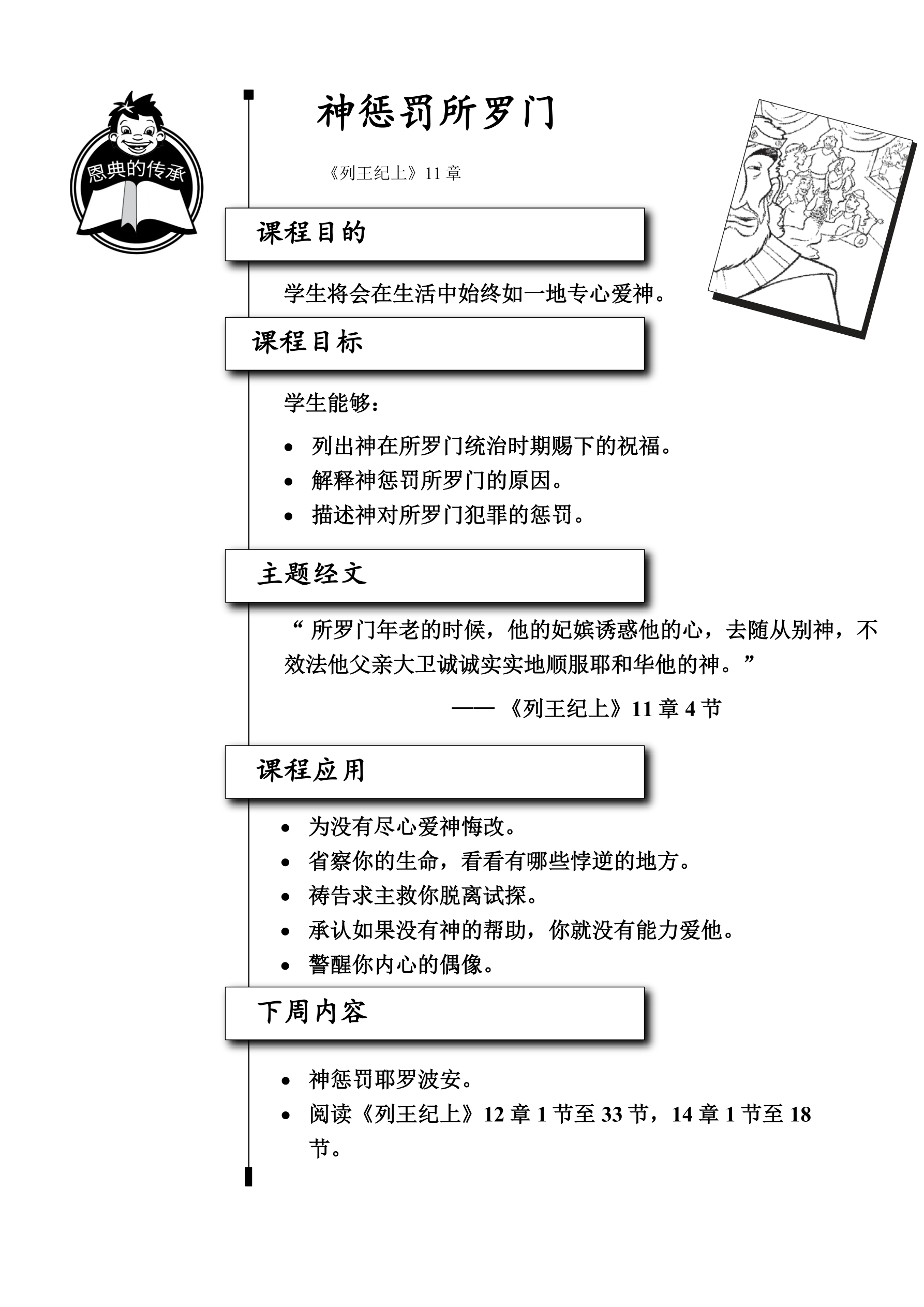 第3课:神惩罚所罗门 预备真理 “你们要将我这话存在心内,留在意中……也要这样教训你们的儿女……”——《申命记》11章18节至19节 请花时间来准备你的心思意念,按着正意分解真理的道(提后2:15)。