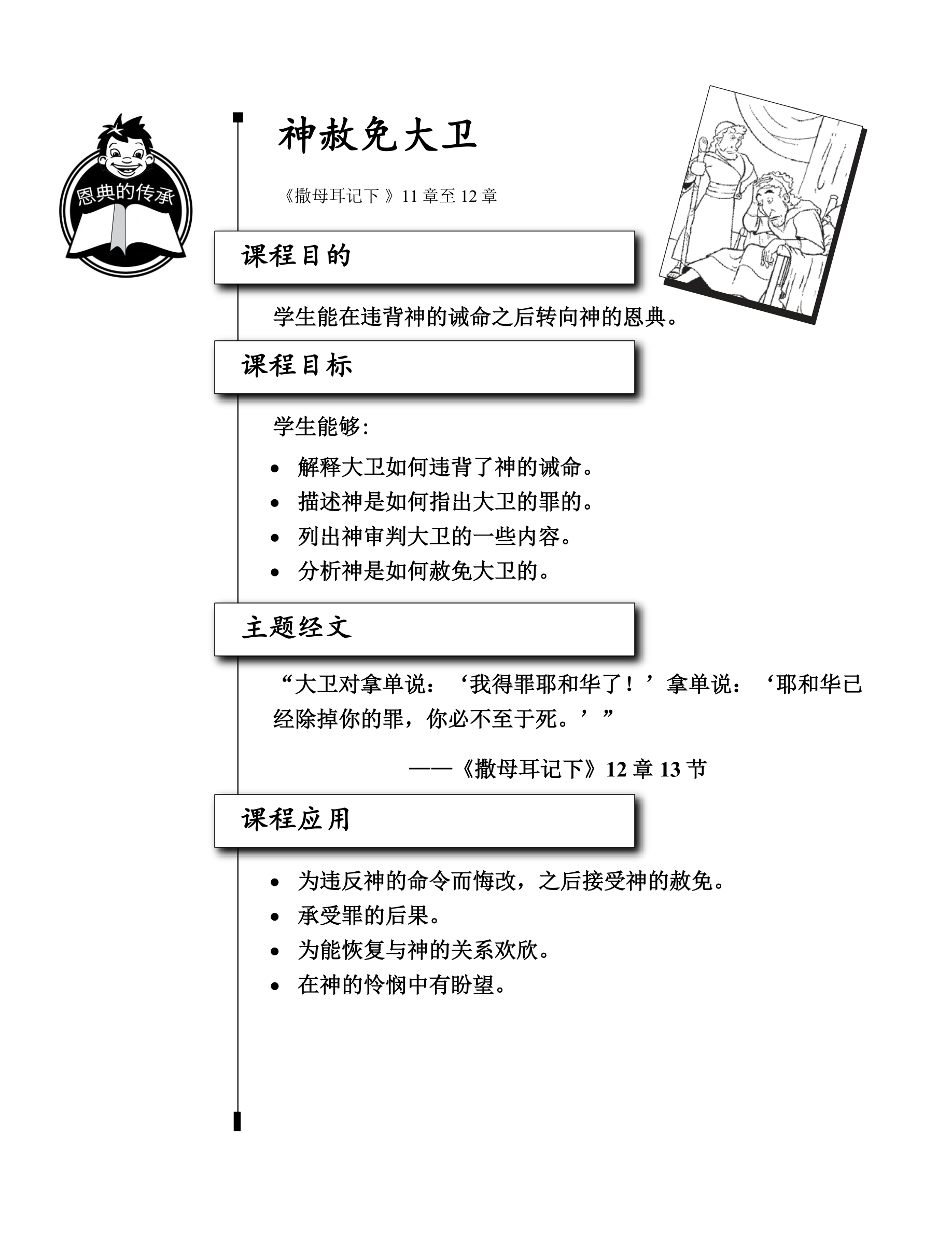 第10课:神赦免大卫 预备真理 “你们要将我这话存在心内,留在意中……也要这样教训你们的儿女……”——《申命记》11章18节至19节 请花时间来准备你的心思意念,按着正意分解真理的道(提后2:15)。