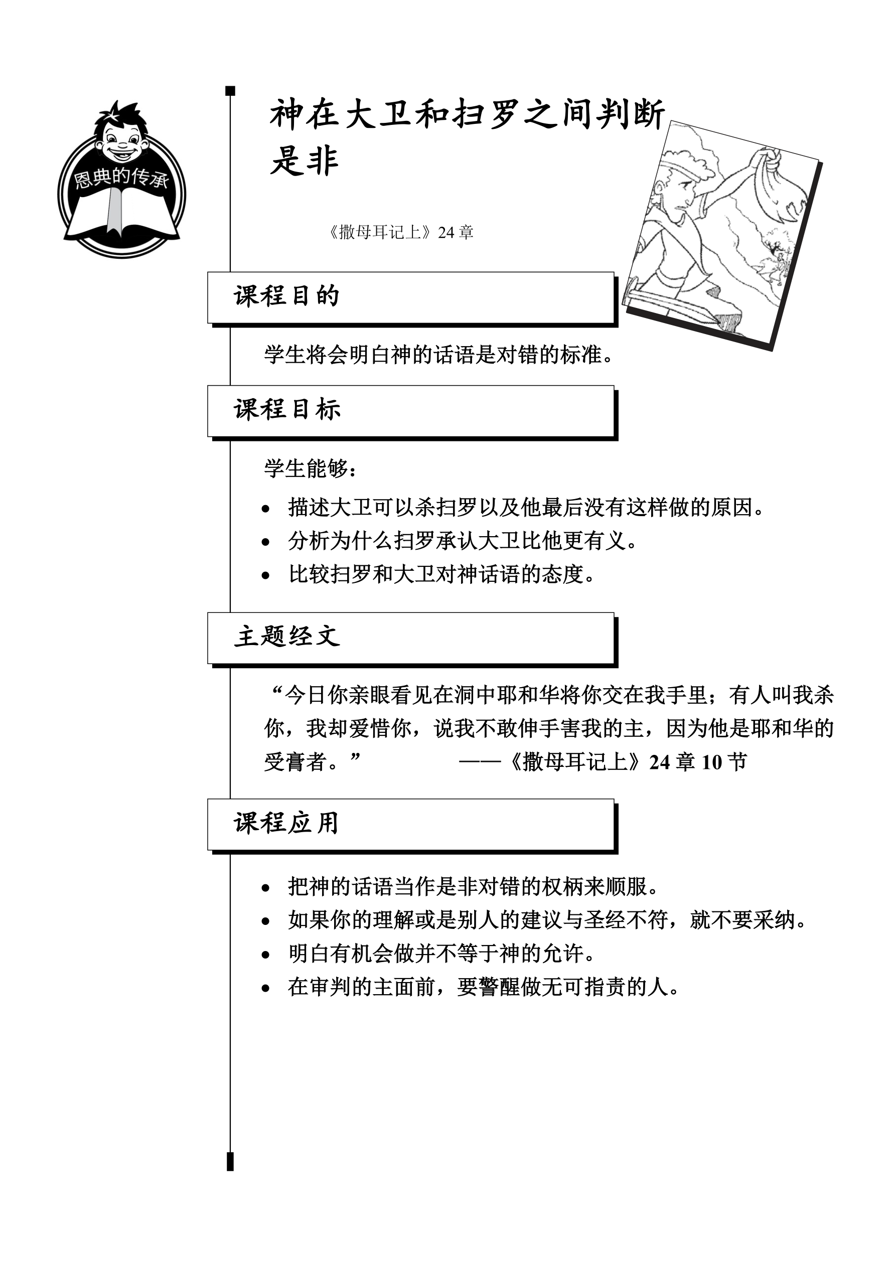 第7课:神在大卫和扫罗之间判断是非 预备真理 “你们要将我这话存在心内,留在意中……也要这样教训你们的儿女……”——《申命记》11章18节至19节 请花时间来准备你的心思意念,按着正意分解真理的道(提