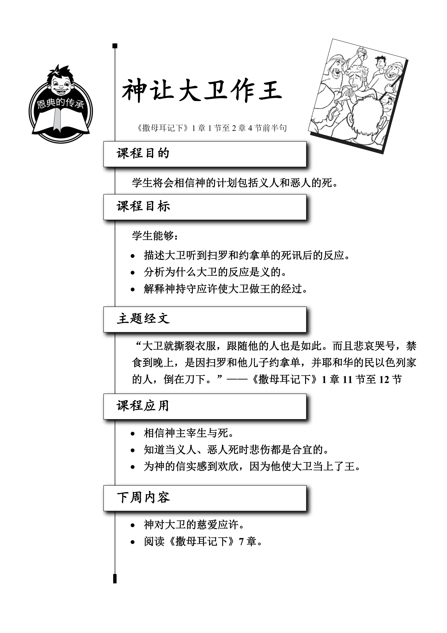 第8课:神让大卫作王 预备真理 “你们要将我这话存在心内,留在意中……也要这样教训你们的儿女……”——《申命记》11章18节至19节 请花时间来准备你的心思意念,按着正意分解真理的道(提后2:15)。
