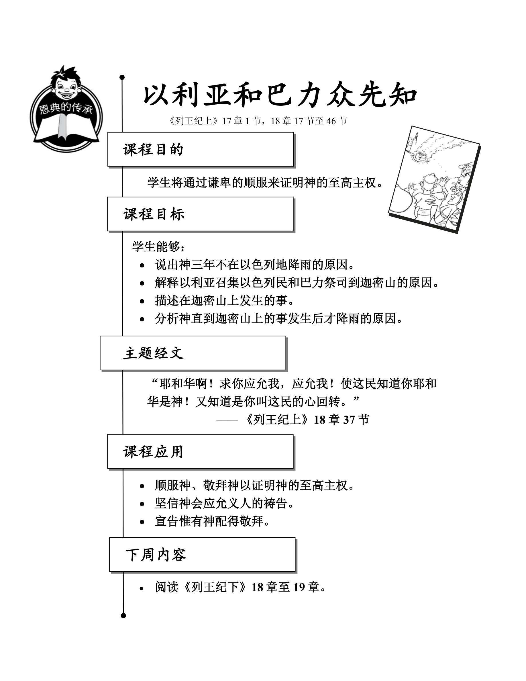 第5课:以利亚和巴力众先知 预备真理 “你们要将我这话存在心内,留在意中……也要这样教训你们的儿女……”——《申命记》11章18节至19节 请花时间来准备你的心思意念,按着正意分解真理的道(提后2:1