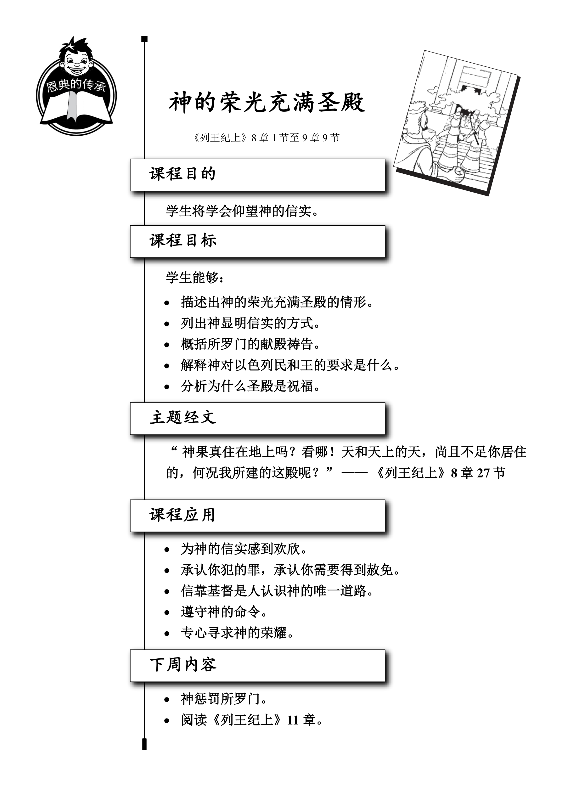 第2课:神的荣光充满圣殿 预备真理 “你们要将我这话存在心内,留在意中……也要这样教训你们的儿女……”——《申命记》11章18节至19节 请花时间来准备你的心思意念,按着正意分解真理的道(提后2:15