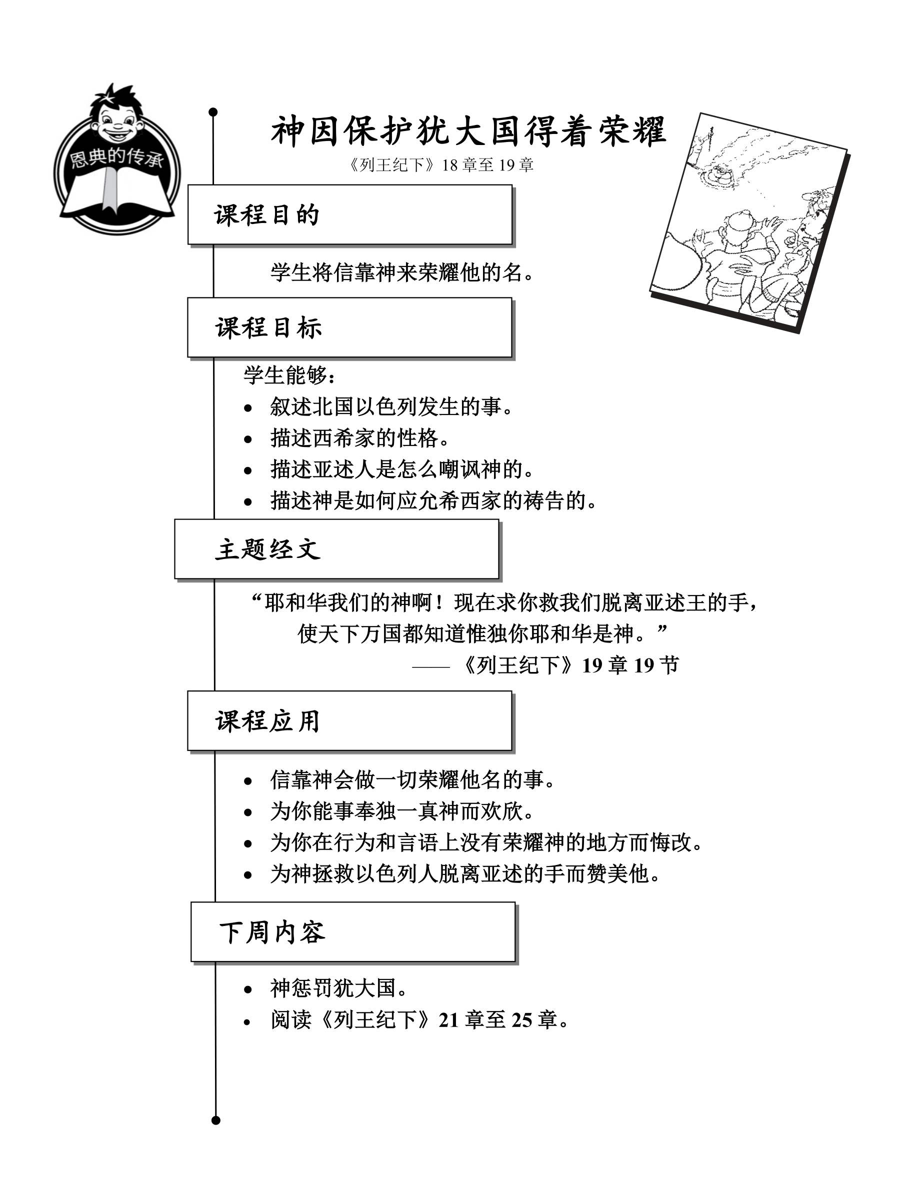 第6课:神因保护犹大国得着荣耀 预备真理 “你们要将我这话存在心内,留在意中……也要这样教训你们的儿女……”——《申命记》11章18节至19节 请花时间来准备你的心思意念,按着正意分解真理的道(提后2